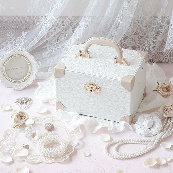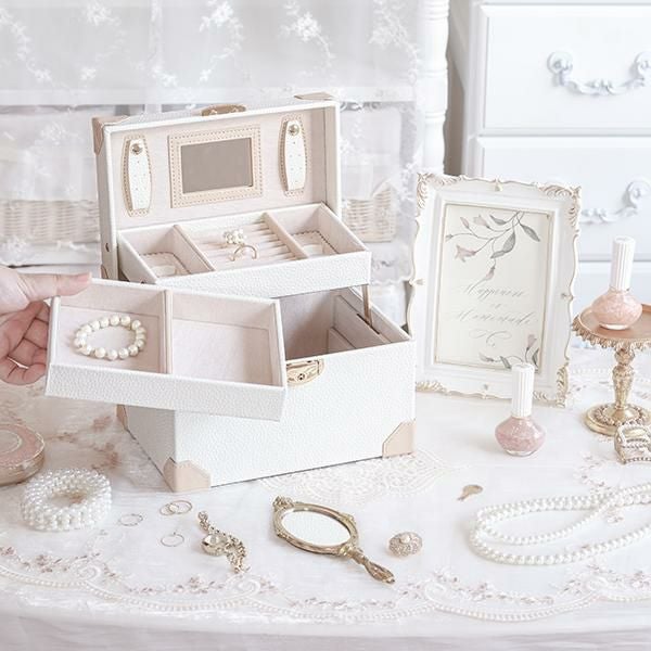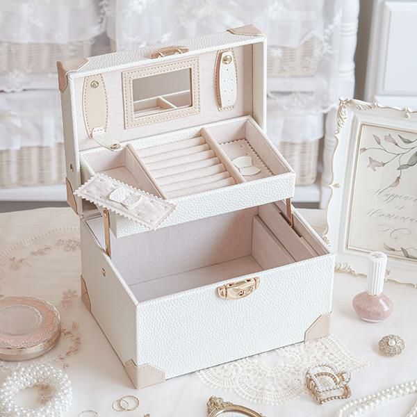 アイボリーとベージュでデザインされたトランク型のジュエリーケース。