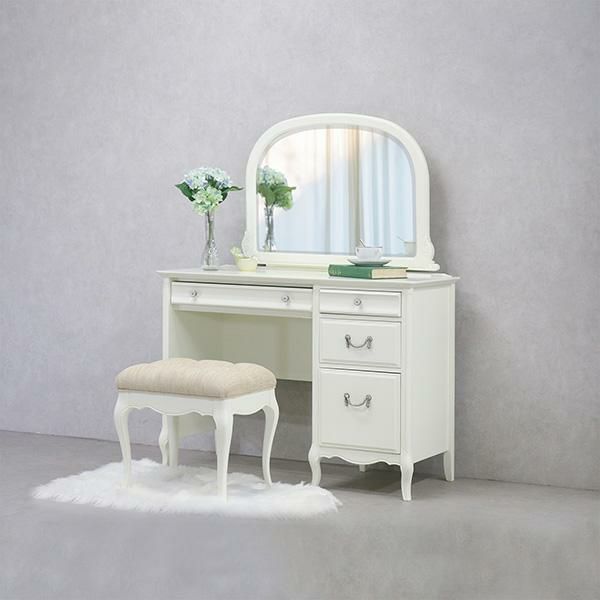 ミラーナWは、柔らかなアイボリーカラーは上品さとナチュラル感覚を併せ持ち、曲面を巧みに活かした丁寧な造りの引出し前板と、宮廷装飾を思わせるシャビー塗装した大きめの把手が印象的なエレガントで高級感漂うシリーズです。