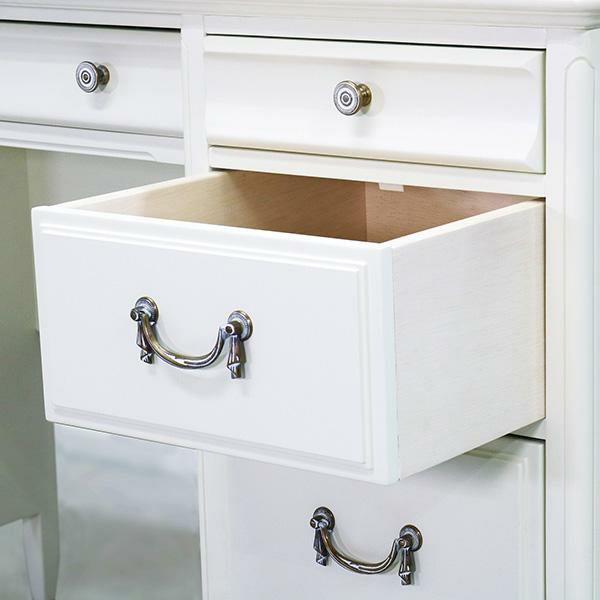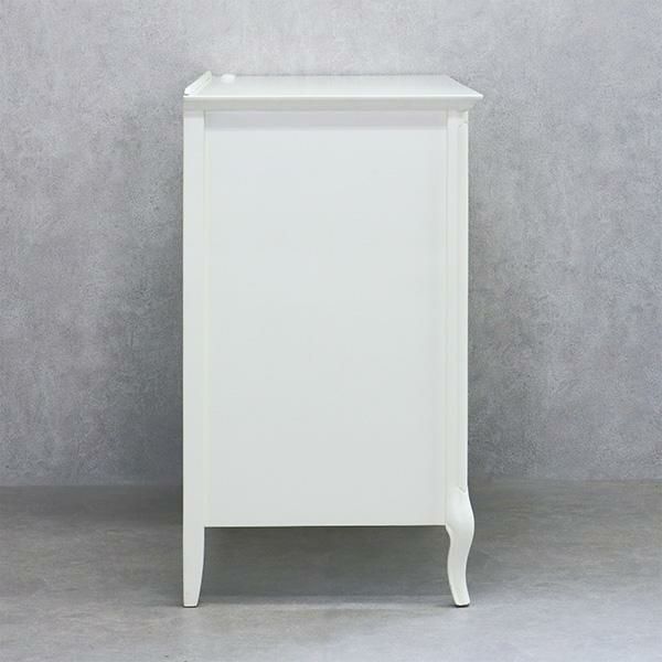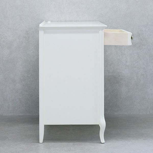 ミラーナWは、柔らかなアイボリーカラーは上品さとナチュラル感覚を併せ持ち、曲面を巧みに活かした丁寧な造りの引出し前板と、宮廷装飾を思わせるシャビー塗装した大きめの把手が印象的なエレガントで高級感漂うシリーズです。