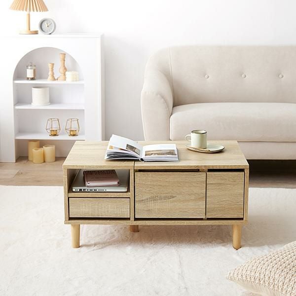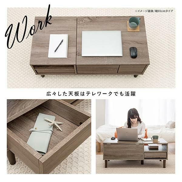 ソファと合わせて食事もとりやすい高さで、3段階に調節が可能なミラーや、前後から引き出せるトレイ収納やオープン収納、深型の引き出しなど、収納力抜群!