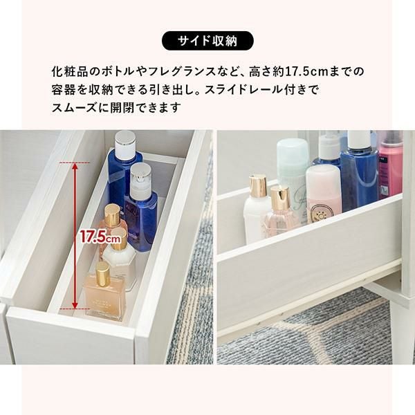 化粧品のボトルや、フレグランスなど高さ約17.5cmまでを収納できる引き出しはスライドレール付きでスムーズ。
