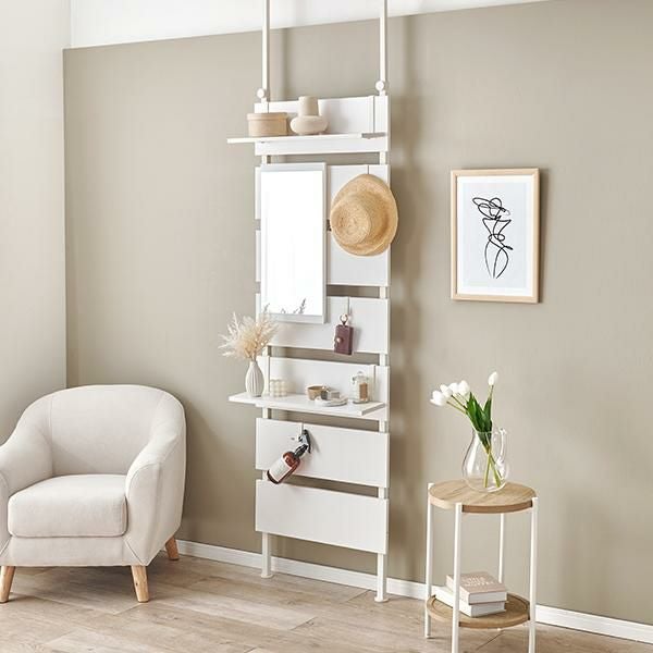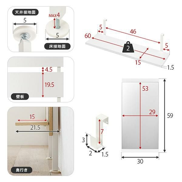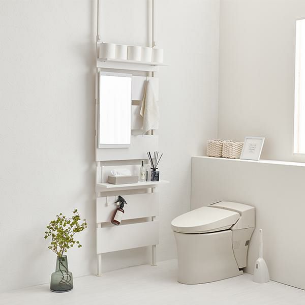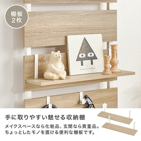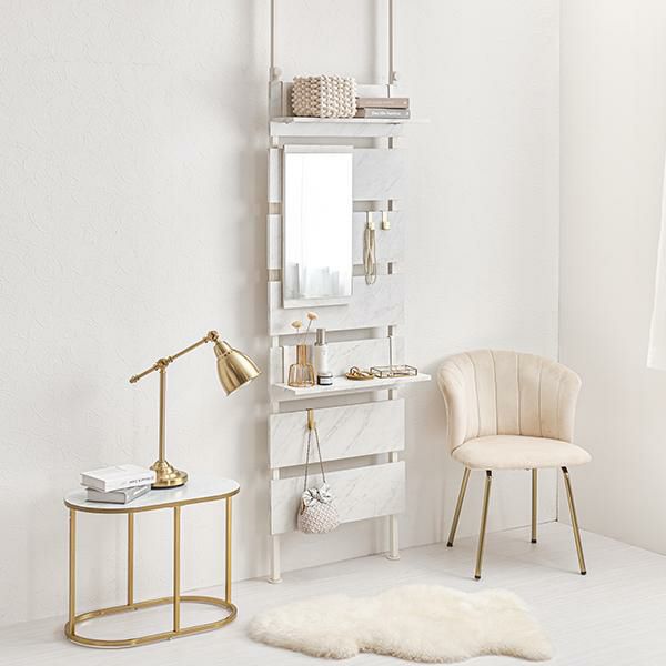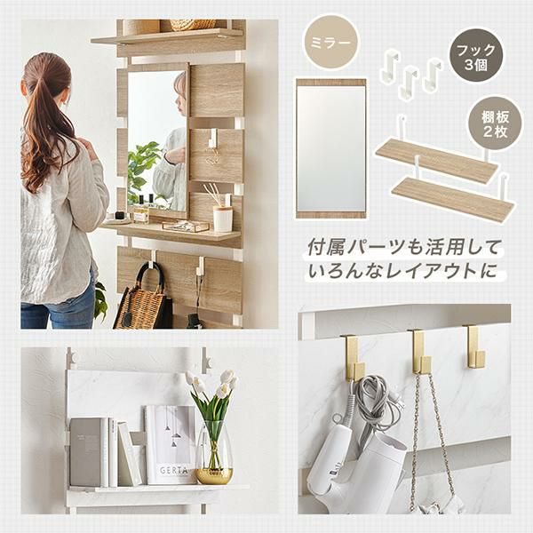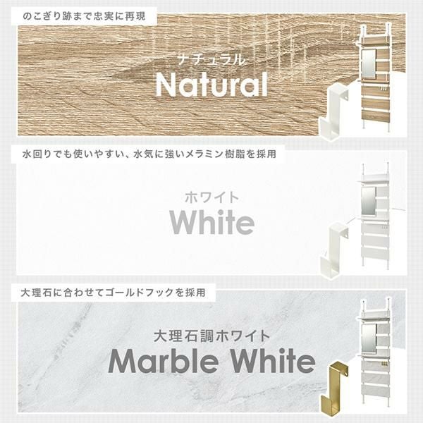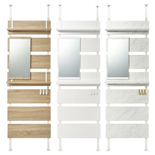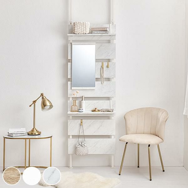 壁面がメイクスペースに変身!上半身がしっかり入る縦型のミラー付きの突っ張りウォールドレッサー。棚板2枚付はメイクスペースならコスメアイテム、玄関なら鍵などの貴重品、ちょっとしたモノを置くのに便利。S字フックは3個付きでよく使うバックや小物の収納がおしゃれに叶います。付属パーツは引っ掛けるだけのフック仕様なので、工具不要で気分に合わせてレイアウト変更もできます。リビングやダイニング、玄関やキッチン、クローク、WIC、脱衣所やランドリールーム、洗面所、トイレなど、お部屋のいろいろな場所に設置可能。「ホワイト」「大理石調ホワイト」「ナチュラル」のカラー3種類でインテリアの雰囲気に選んでいただけます。