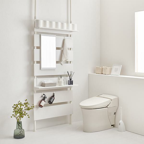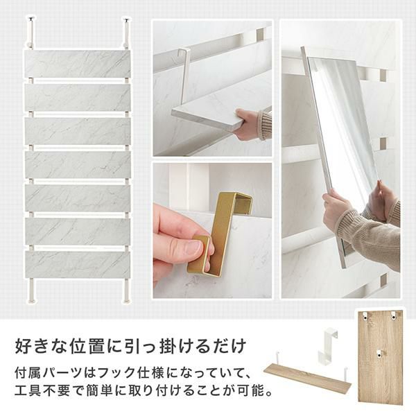 壁面がメイクスペースに変身!上半身がしっかり入る縦型のミラー付きの突っ張りウォールドレッサー。棚板2枚付はメイクスペースならコスメアイテム、玄関なら鍵などの貴重品、ちょっとしたモノを置くのに便利。S字フックは3個付きでよく使うバックや小物の収納がおしゃれに叶います。付属パーツは引っ掛けるだけのフック仕様なので、工具不要で気分に合わせてレイアウト変更もできます。リビングやダイニング、玄関やキッチン、クローク、WIC、脱衣所やランドリールーム、洗面所、トイレなど、お部屋のいろいろな場所に設置可能。「ホワイト」「大理石調ホワイト」「ナチュラル」のカラー3種類でインテリアの雰囲気に選んでいただけます。
