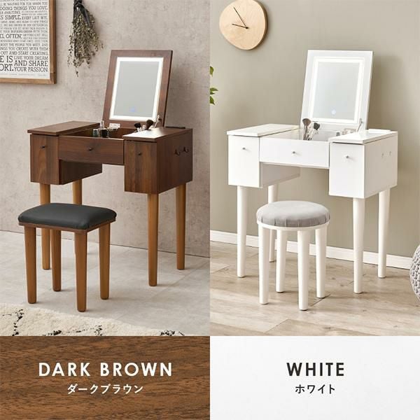 コンパクトなサイズ感なのに収納力抜群。ミラーの角度を自分に合う角度に調整できるので顔が見やすい設計です。LEDライトの明るさは無段階調整可能。外出先の照明環境に合わせてのメイクが叶います。シンプル&すっきりとしたデザインなので、コンパクトなワンルームでも圧迫感を感じにくい!両サイドの収納は「天板」と「引出し」両方から出し入れ可能です。側面のフックがあることで、ドライヤーやアイロンなどを引っ掛けて収納することが可能なのも嬉しいポイント♪