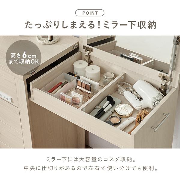 そんなコンパクトなお部屋の悩みにも寄り添う、1台3役の万能ドレッサーデスクです。天板を上げれば、大きなミラーがお出迎え。お気に入りのコスメを並べれば心ときめくドレッサーに。天板を閉じればフラットなデスクに早変わりするので、PC作業や読書、日記を書く時間など、自分らしく過ごすワークスペースとしても活躍します。さらに、チェスト並みのたっぷりとした収納力も嬉しいポイント。引き出しには散らかりがちなコスメや文房具をすっきり整理でき、深型の収納エリアには、置き場所に困る高さのあるボトル類もしっかり収まります。限られたスペースを有効活用しながら、お部屋の雰囲気もクラスアップ。「お仕事や勉強、メイクも、お片付けも」すべてをスマートに支えてくれる、一人暮らしのワンルームにぴったりな一台です。