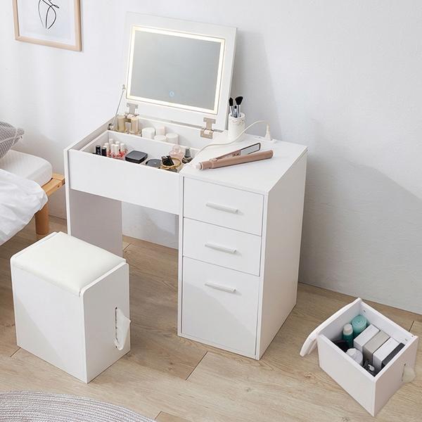 毎日のメイク時間を、もっと快適に。ミラーの周囲にあしらわれたLEDライトが、お肌のコンディションや細かな色味まで鮮明に映し出し、理想の仕上がりをサポートしてくれます。使いやすさにこだわったミラーは、角度調整が可能。どんな姿勢でも一番きれいに見えるポジションで、メイクを心ゆくまで楽しめます。天板下や引き出しには、お気に入りのコスメやスキンケアアイテムをたっぷり、そして美しく収納。さらに手元にはコンセントが付いているので、ヘアアイロンやドライヤーでのセットもスムーズに叶います。セットのお揃いスツールには、置き場所に困るティッシュまで収納できる優れもの。シンプルながらも充実した機能美が、一人暮らしの限られたスペースにもすっと馴染みます。