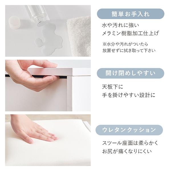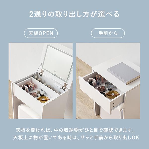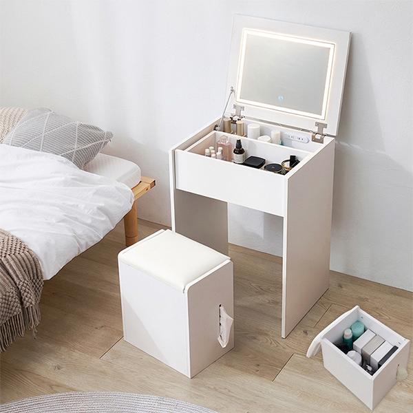 毎日のメイク時間を、もっと快適に。ミラーの周囲にあしらわれたLEDライトが、お肌のコンディションや細かな色味まで鮮明に映し出し、理想の仕上がりをサポートしてくれます。使いやすさにこだわったミラーは、角度調整が可能。どんな姿勢でも一番きれいに見えるポジションでメイクを楽しめます。天板下には、お気に入りのコスメやスキンケアアイテムを美しく収納。さらに手元にはコンセントが付いているので、ヘアアイロンやドライヤーでのセットもスムーズに叶います。セットのお揃いスツールには、置き場所に困るティッシュまで収納できる優れもの。シンプルながらも充実した機能美が、一人暮らしの限られたスペースにもすっと馴染みます。