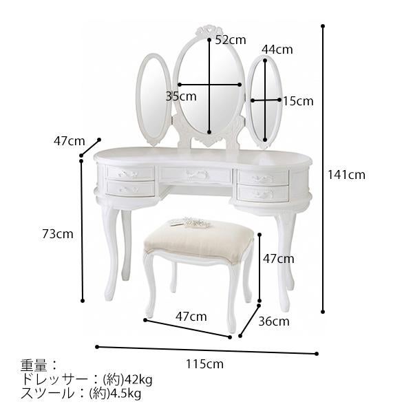 白の美しさを大切に仕上げた、リュクスなムード溢れるドレッサー。全体を清らかなピュアホワイトで統一し、すっきりとした清潔感のあるデザインにこだわりました。これまでのアンティーク加工を施さない「全塗装仕上げ」を採用したことで、シルエットがより一層引き立ち、凛とした落ち着きのある空間を演出。お部屋をパッと明るく、洗練された印象に見せてくれます。細部にもこだわり、オールホワイトでまとめたことで、脚部や幕板に施された繊細な手彫り装飾がより美しく映え、猫脚のしなやかな曲線美をゆったりと楽しむことができます。セットのスツールにはミルクティカラーのベロア調生地を採用。無地ならではの柔らかな光沢が、さりげない高級感を添えてくれます。また、その優美な佇まいながら、充実した収納力も魅力のひとつです。合計5杯の引き出しを備えており、散らかりがちなメイク道具やスキンケア用品、アクセサリーまで、用途に合わせてすっきりと整理が可能。圧倒的な存在感で、鏡の前に座るたび、心ときめく憧れの世界へと誘います。