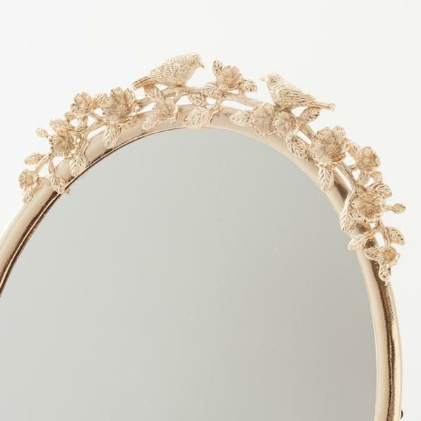 ミラーの淵に沿うように咲いたお花と鳥がロマンティック。自立型の鏡なのでどこでも置いて使用することができます。