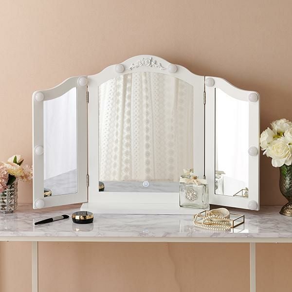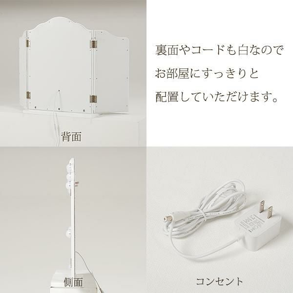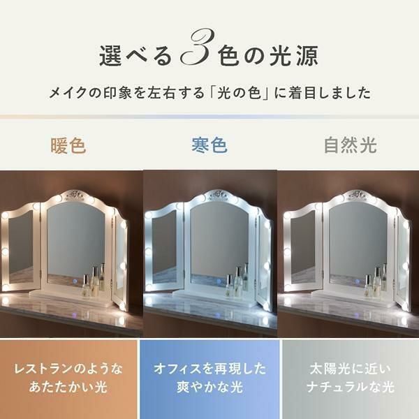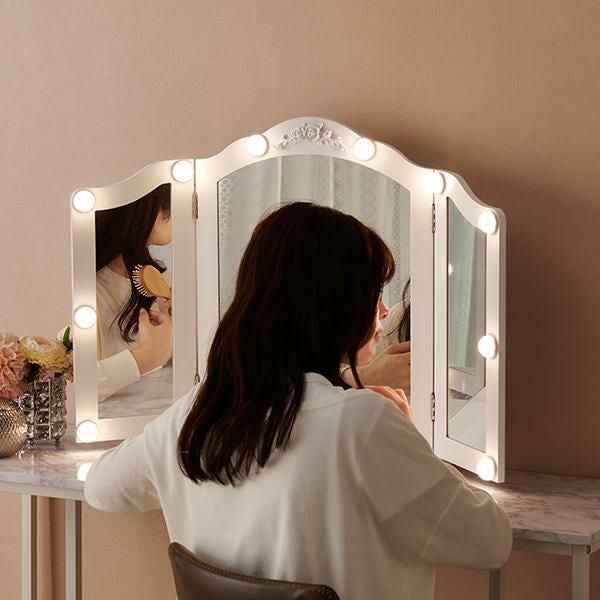 ローズモチーフのレリーフが美しい、リュクスなムードのライト付き三面鏡ミラー