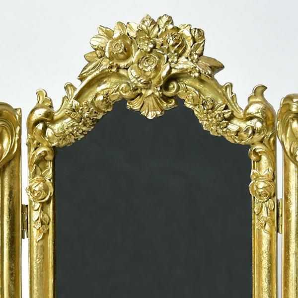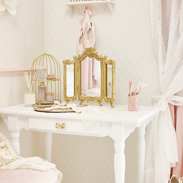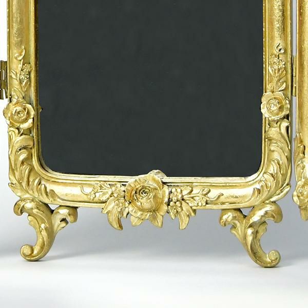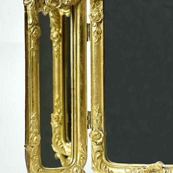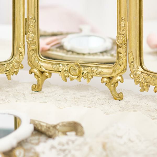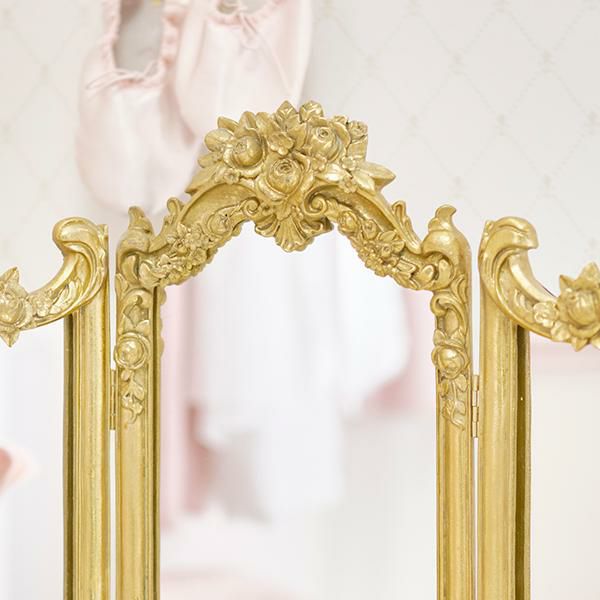 デスクやチェストの上に置くだけで、お部屋の主役になる三面鏡。重厚感があり華やかなデザインはインパクト抜群で、トップの立体感のあるローズがバロック調でアンティークなムードです。