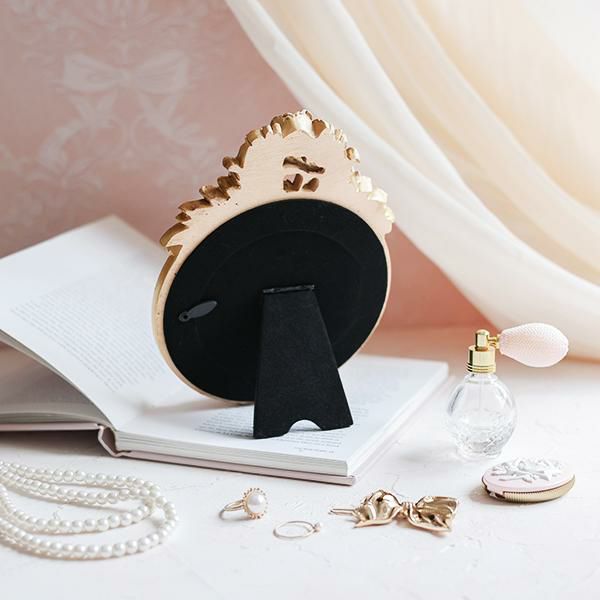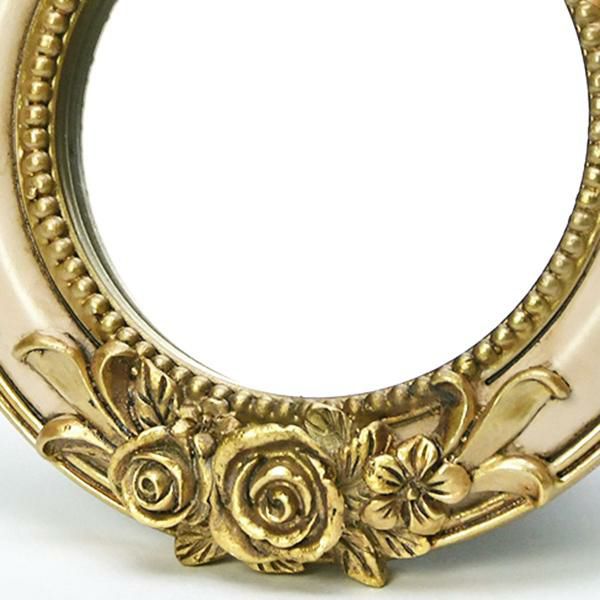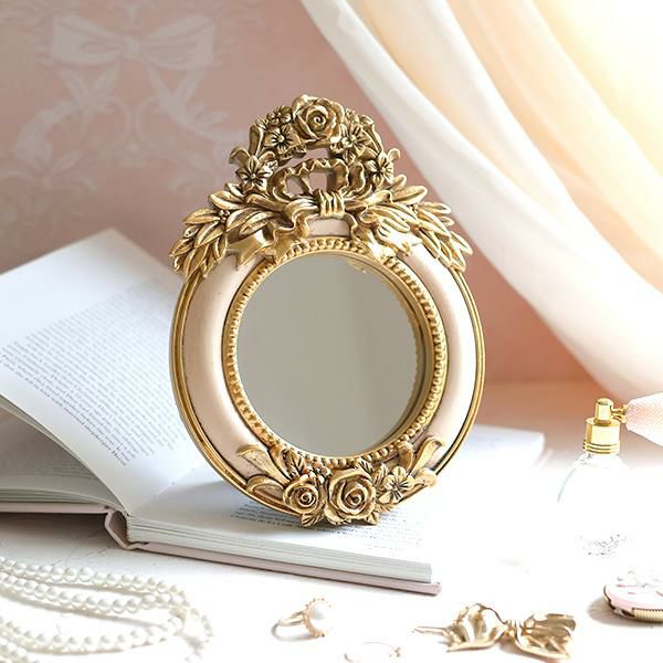 ピンクベージュとゴールドの配色が優しく上品な鏡。スタンド式のミラーにゴージャスなバラのレリーフが施されていて存在感たっぷり。小ぶりなサイズなので置く場所を選びません。