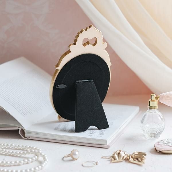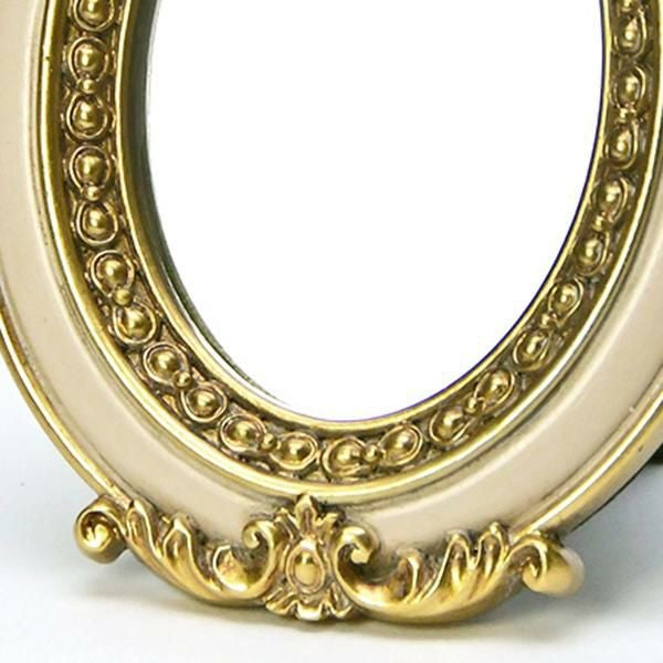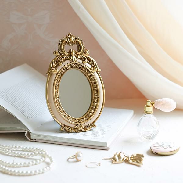 ピンクベージュとゴールドの配色が優しく上品な鏡。スタンド式のミラーにゴージャスなバラのレリーフが施されていて存在感たっぷり。小ぶりなサイズなので置く場所を選びません。