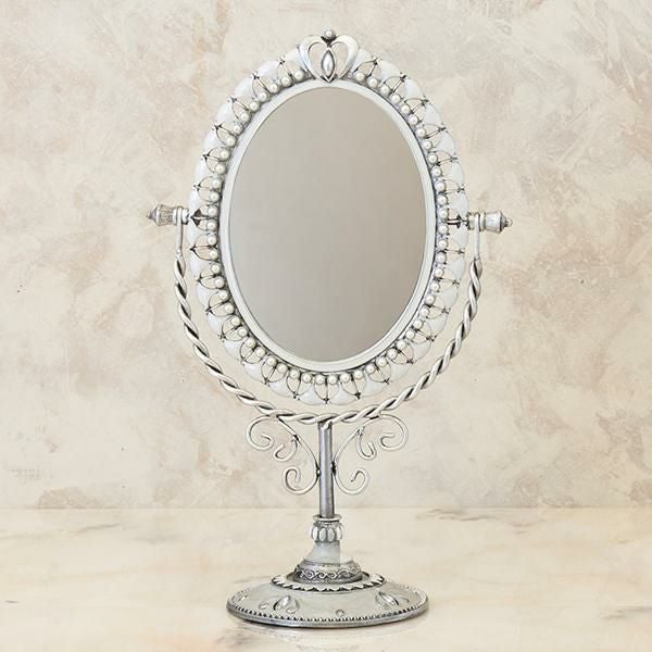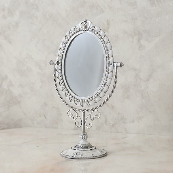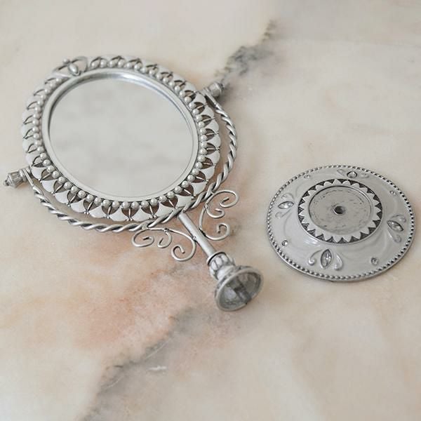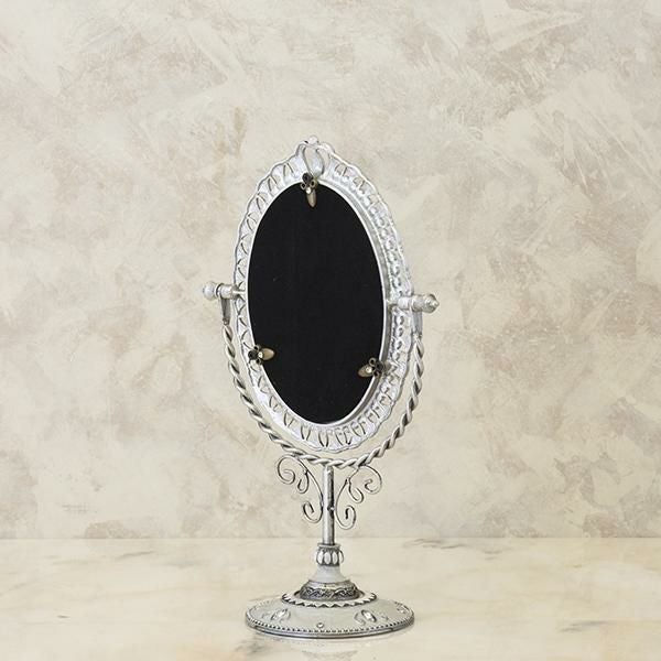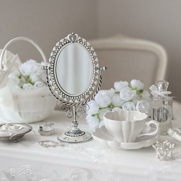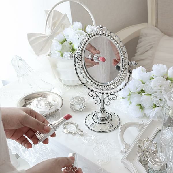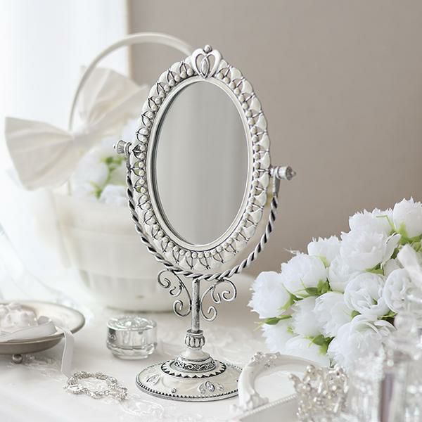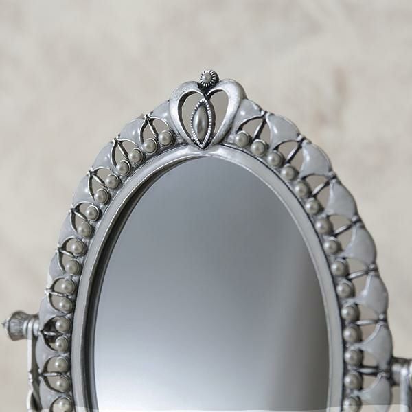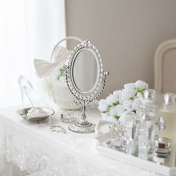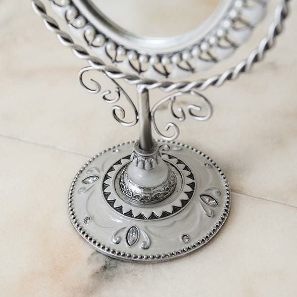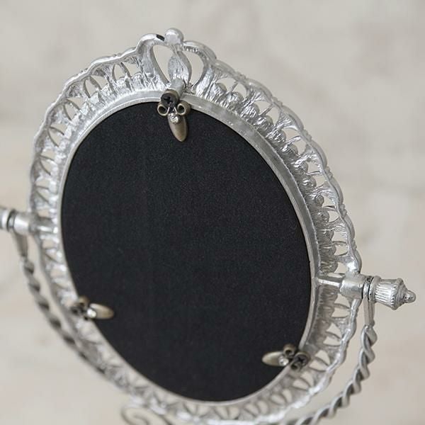 丁度良い小ぶりなサイズ感で、シルバーブラックの墨が入ったようなアンティークなカラーは重厚感があります。ビジューや少し黄色みでグレーがかったホワイトカラーを合わせ更に落ち着いたムードに。細かい装飾が施されたエレガントなデザインは置くだけでお部屋が華やかになります。鏡の角度も自由に変えらるのも嬉しいポイント!