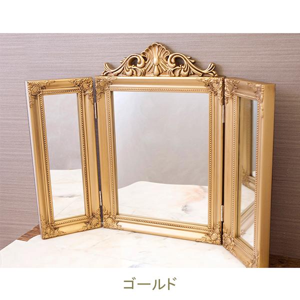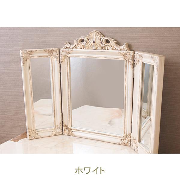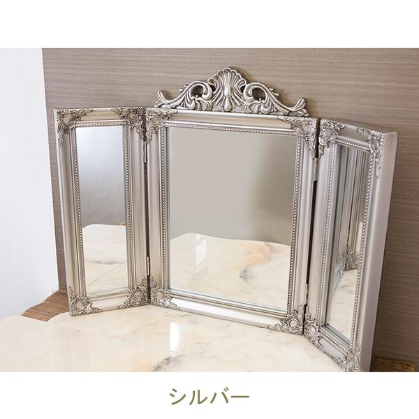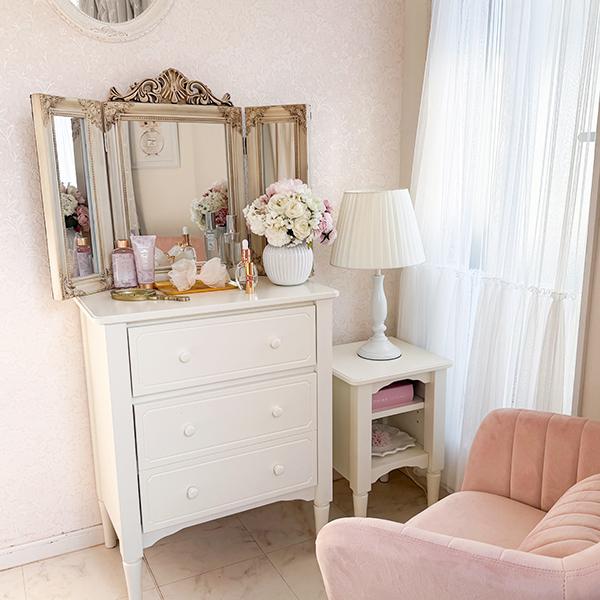 繊細なデザインが上品な三面ミラー。近くで見ても、離れて見ても圧倒的な存在感。三方向からの視界を可能にするので、メイクやヘアスタイルの左右のバランスチェックがより便利に。インテリアとしてはもちろん、実用性も兼ね備えた一品です。