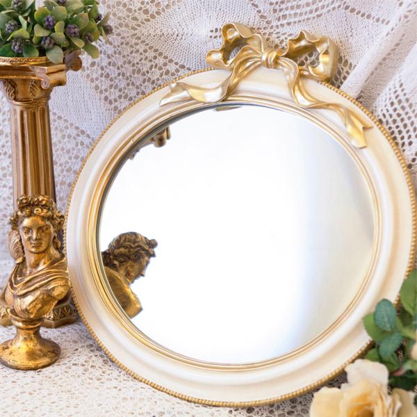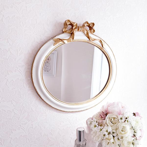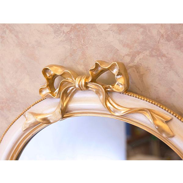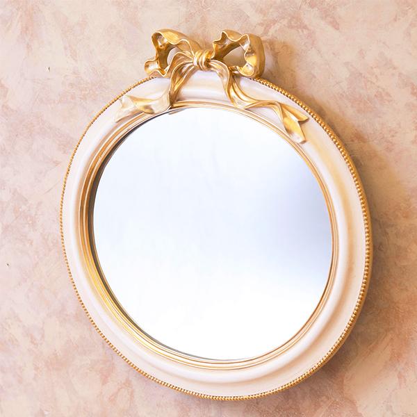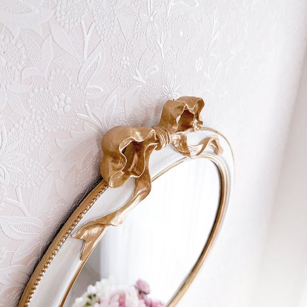 ふんわりと結ばれたような、トップのリボンが愛らしいアクセント。 繊細なディテールが光る、ヨーロピアンデザインの壁掛けミラー。主張しすぎない「さりげない可愛さ」は、大人のフレンチシャビースタイルや、クラシカルなお部屋にもぴったり。 壁に飾るだけで空間がパッと明るくなり、ワンランク上の洗練されたインテリアを演出してくれます。