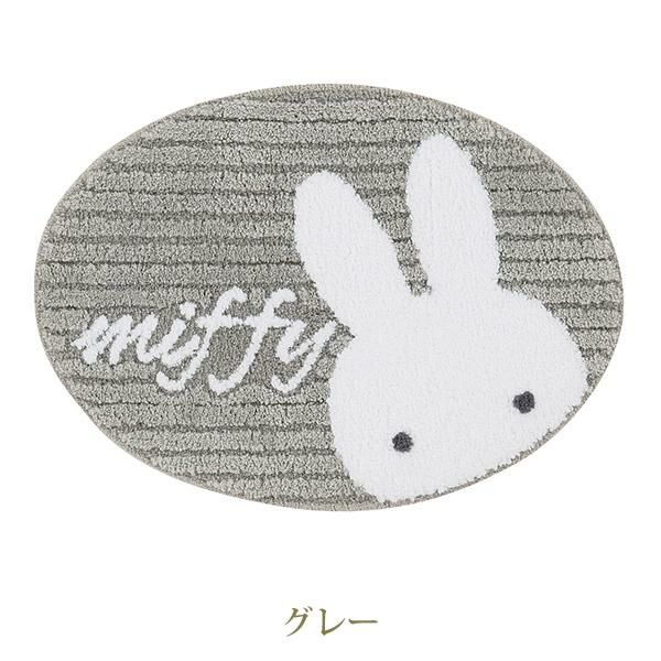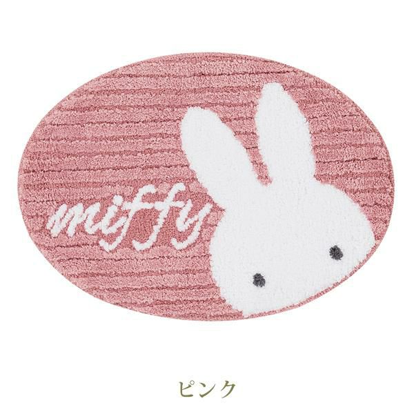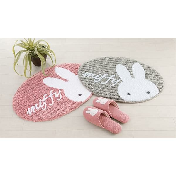 色の濃淡とハイ&ローパイルで表現したシンプルなストライプデザインに、ひょっこり顔を覗かせているミッフィーが可愛いアクセントマット。miffyの文字にアップのお顔に癒されます。ポリエステルの優しい質感もポイント。