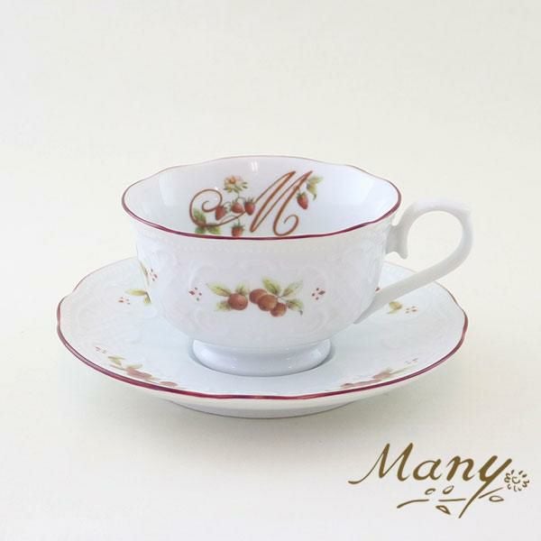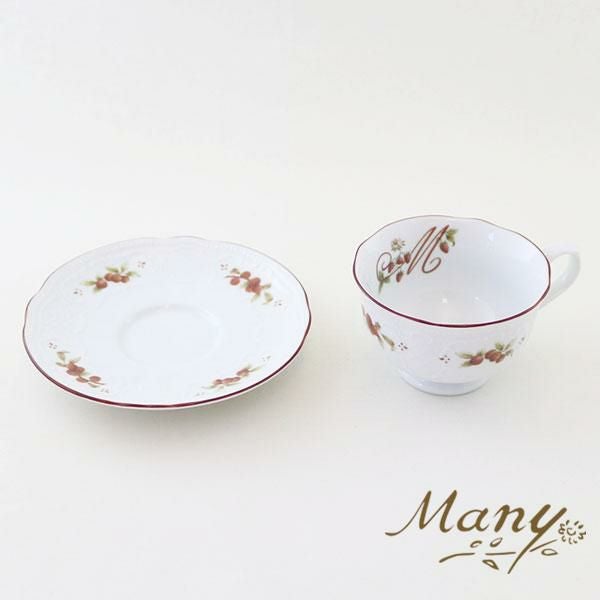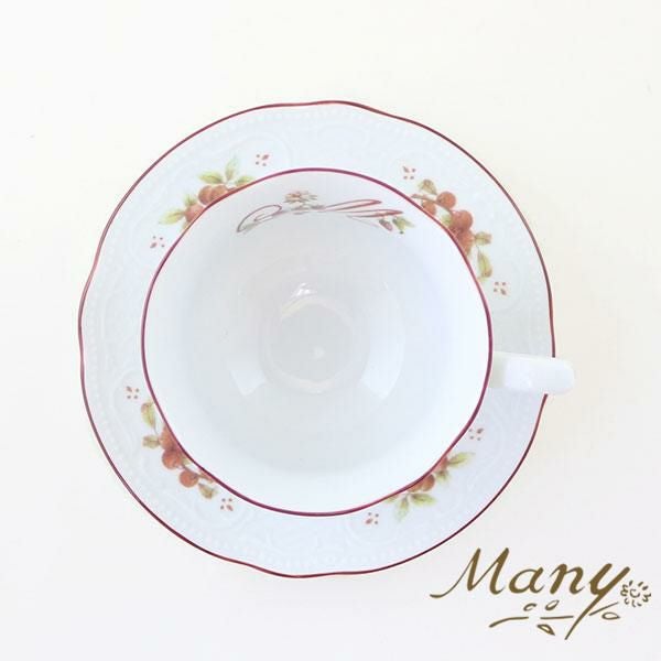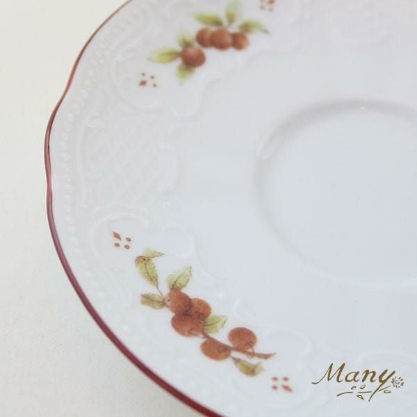 カップの中のMのロゴと、周りに縁どられたレースのホワイトの浮き彫り加工に木の実がカントリーな雰囲気。