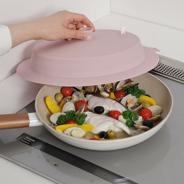 フライパンで調理する際のフタとしてだけでなく、蒸気弁付きなので蓋をしたまま電子レンジの使用もOK。ドーム型で水滴をしっかりキャッチし、ラップ代わりにも使えます。使わない時は折りたたんでグンとコンパクトに!フック掛けできる仕様で、置き場所に困らずすぐに取り出せます。