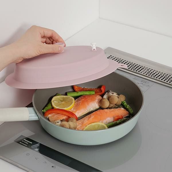 フライパンで調理する際のフタとしてだけでなく、蒸気弁付きなので蓋をしたまま電子レンジの使用もOK。ドーム型で水滴をしっかりキャッチし、ラップ代わりにも使えます。使わない時は折りたたんでグンとコンパクトに!フック掛けできる仕様で、置き場所に困らずすぐに取り出せます。