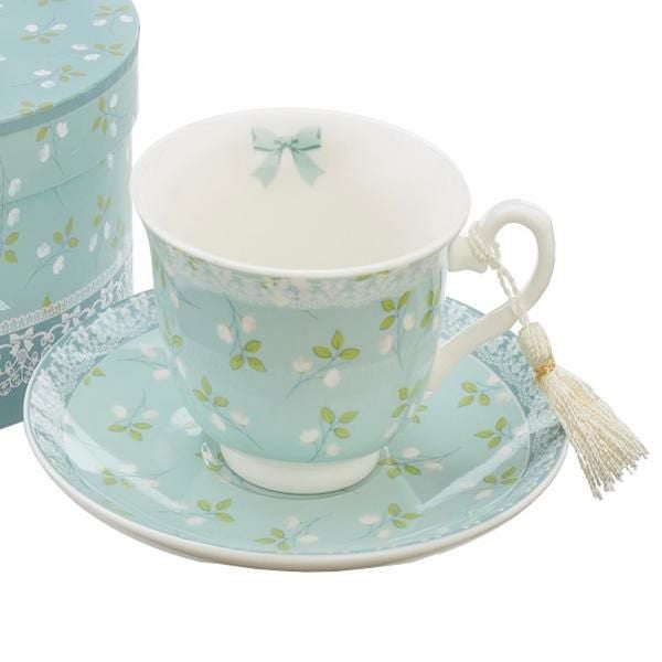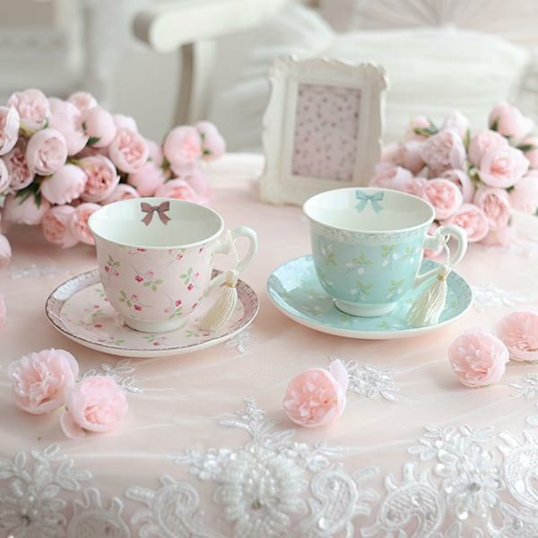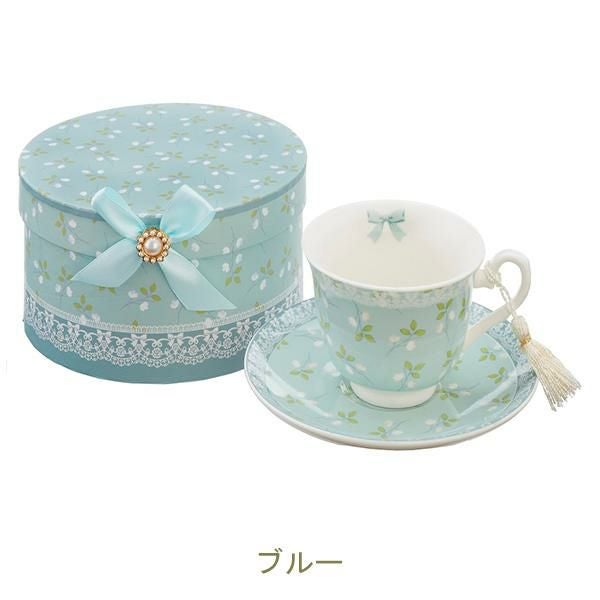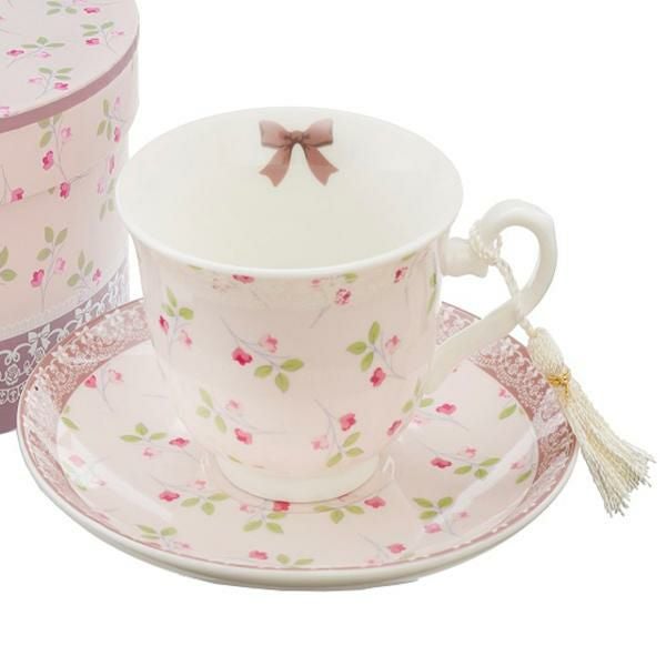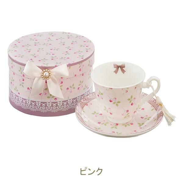 カップ内側のリボンとソーサー下のレース模様が上品な、電子レンジ対応のカップアンドソーサー。ギフトBOXに入っているのでギフトにもオススメ。大人可愛い食器で優雅なティータイムを過ごせそう。