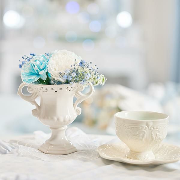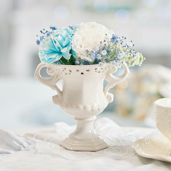 小ぶりのサイズが飾りやすい、陶器製のフラワーベース。アラベスク模様が施されエレガントな仕上がりの花瓶は、釉薬で仕上げているため、色味や柄の出方が1点1点異なるのも特別感があって嬉しい。