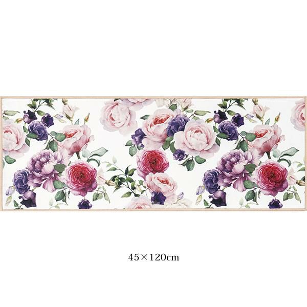 転写プリントならではの細かな表現が目を惹く45×120cmのロングマット。水彩画タッチで表現された薔薇が華やかに足元を彩ります。ポリエステル素材を使用し足触り良く仕上げました。