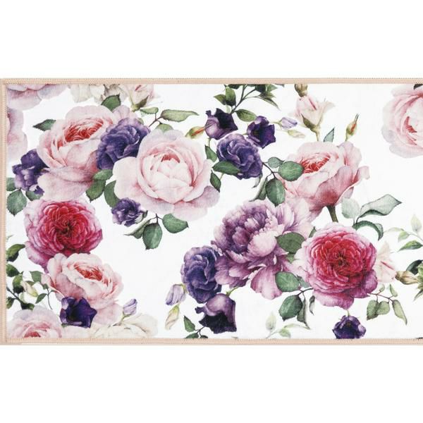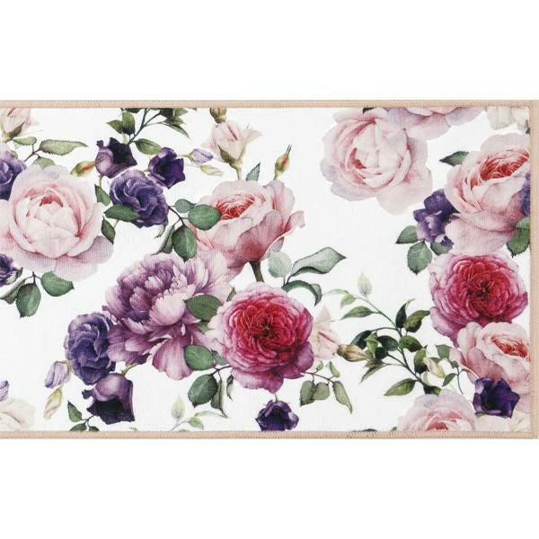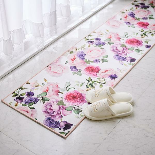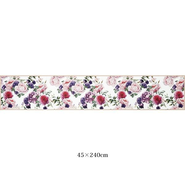 転写プリントならではの細かな表現が目を惹く45×240cmのロングマット。水彩画タッチで表現された薔薇が華やかに足元を彩ります。ポリエステル素材を使用し足触り良く仕上げました。