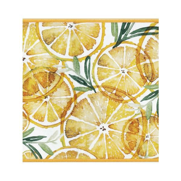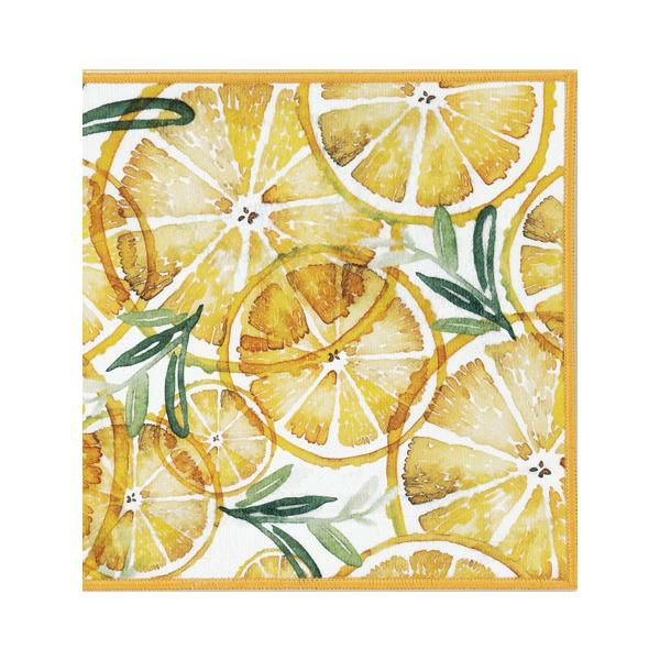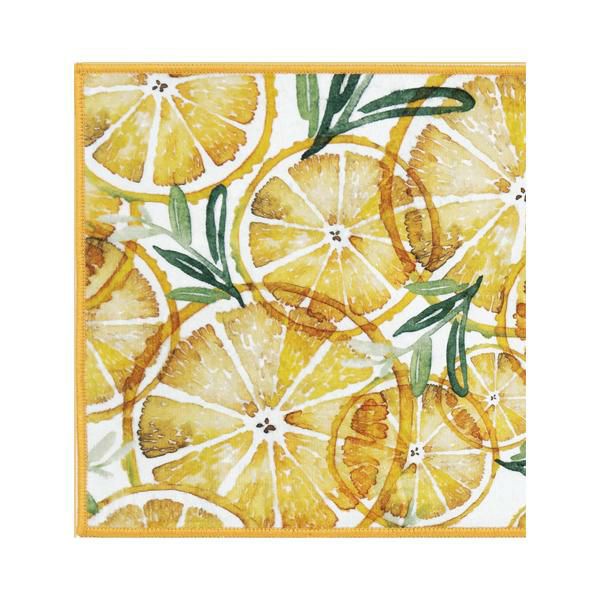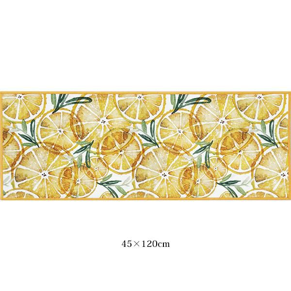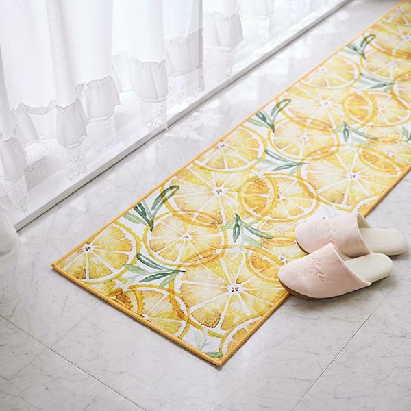 転写プリントならではの細かな表現が目を惹く45×120cmのロングマット。フレッシュなレモンが重なる、清涼感溢れる足元に。ポリエステル素材を使用し足触り良く仕上げました。