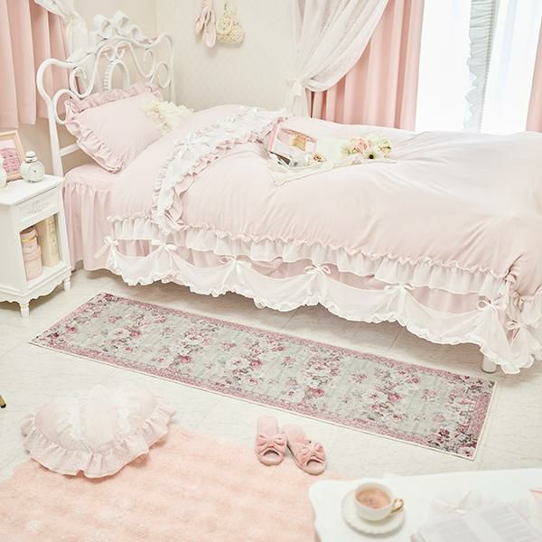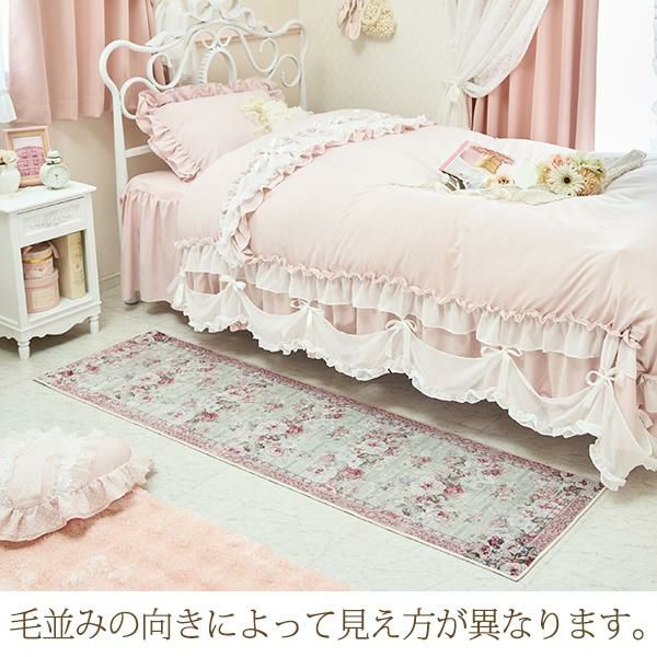 繊細にデザインされたローズとレースのプリント模様が美しい、マルチマット。少しかすれたようなタッチは儚げな印象で主張し過ぎず、玄関やベッドサイドにアクセントマットとして、上品にお部屋を彩ります。