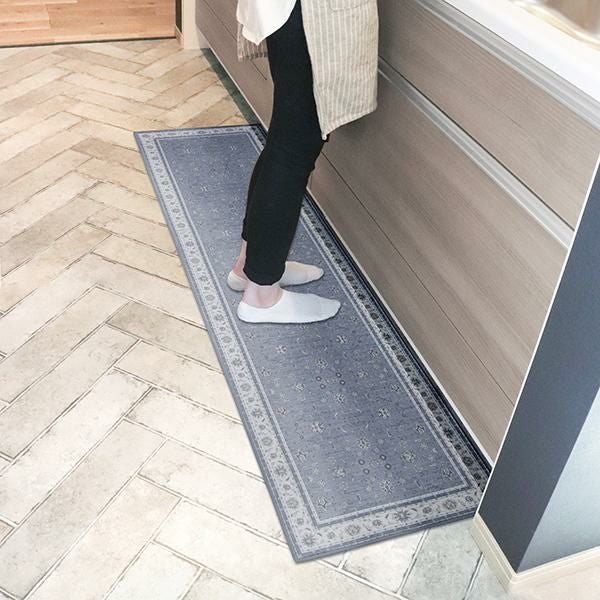 キッチンや玄関、ソファーやベッドの足元に敷いてお部屋のアクセントに。小さく折りたためるので、洗濯ネットに入れて洗濯機で丸洗いできます。また、フラットなので、引き出しが開閉しやすく、掃除機が掛けやすいのも嬉しいポイント♪