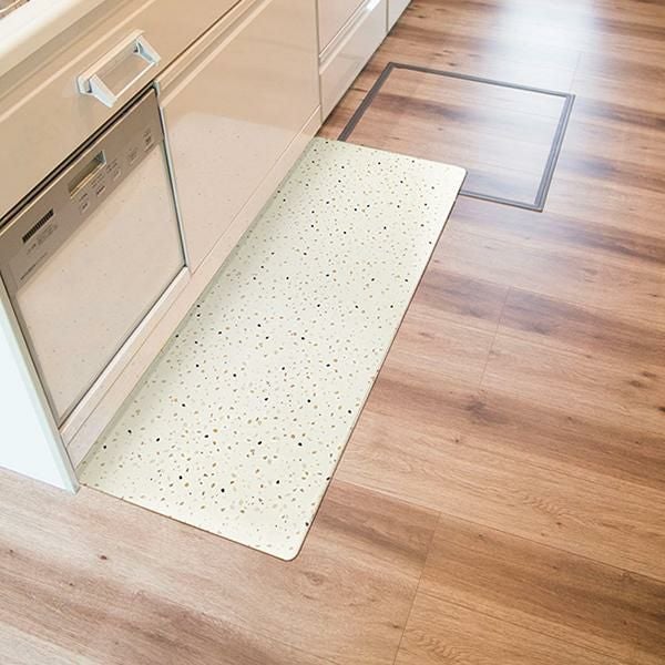 独特なテクスチャーがオシャレなテラゾー柄で足元を明るく華やかに!キッチンマットとしてだけではなく、ソファーやベッドの足元に敷いてお部屋のアクセントしても。