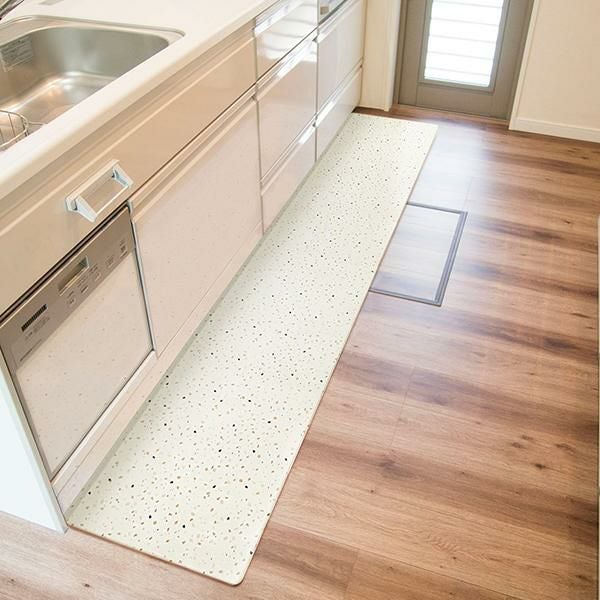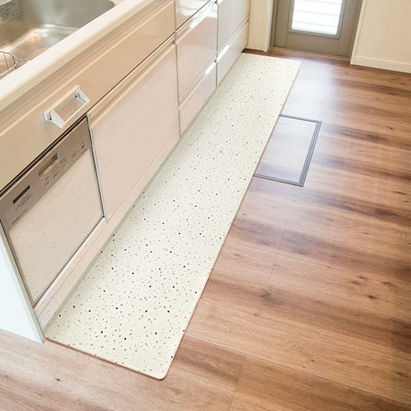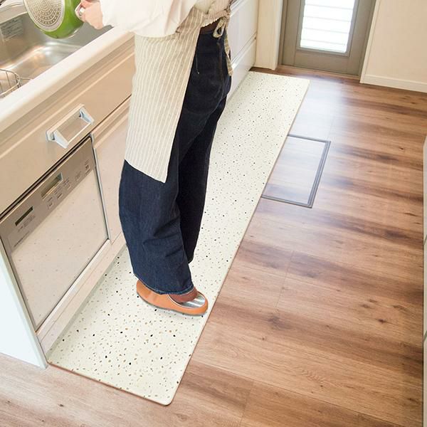 独特なテクスチャーがオシャレなテラゾー柄で足元を明るく華やかに!キッチンマットとしてだけではなく、ソファーやベッドの足元に敷いてお部屋のアクセントしても。