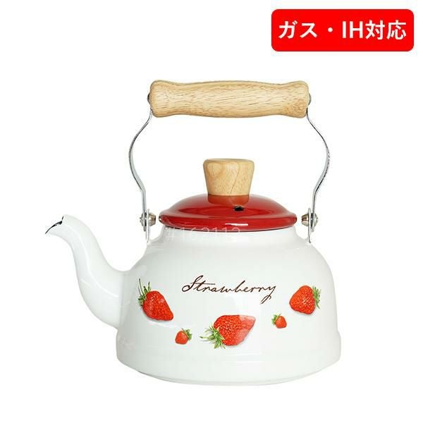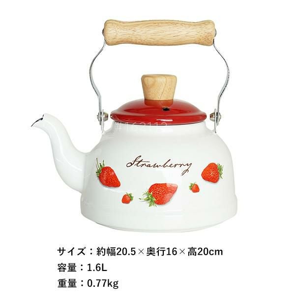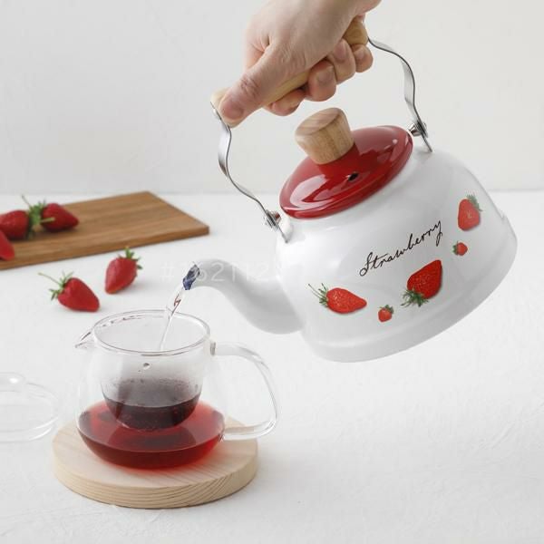 レトロ感のあるいちご柄と天然木のナチュラルな素材感がどこか懐かしい。使いやすいホーロー小型ケトル