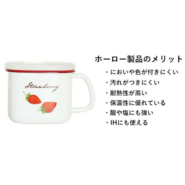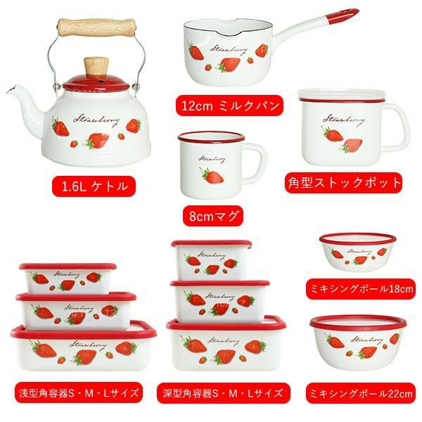 ・揃えたくなるイチゴ柄のデザインで、キッチンに置いておくだけでかわいい空間を作れるホーローシリーズです。