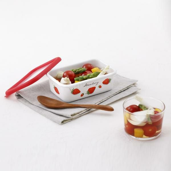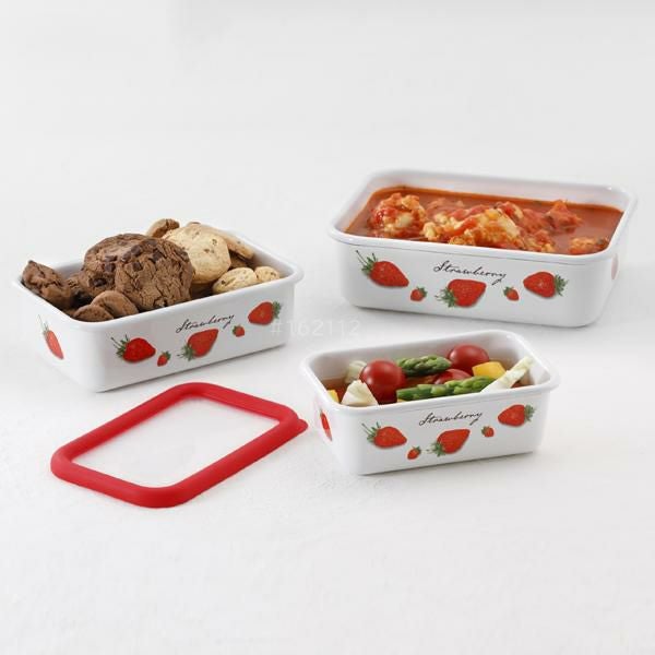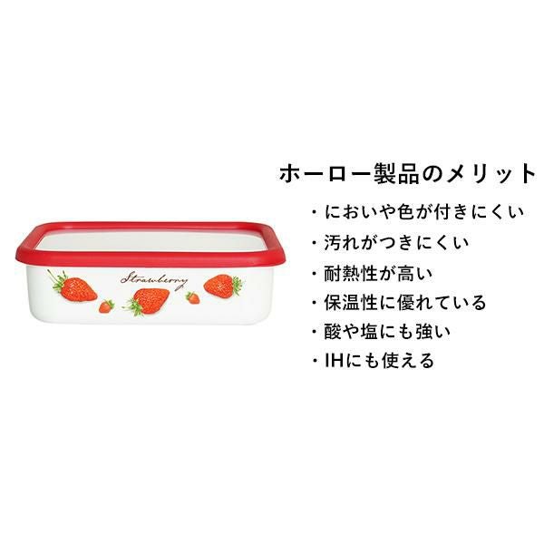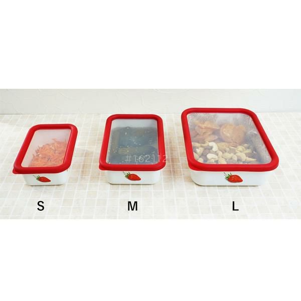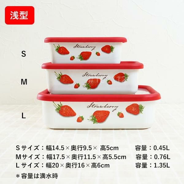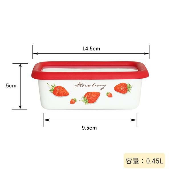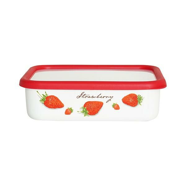 レトロ感のあるいちご柄がかわいい!様々な食材のストックに使える蓋付ホーロー浅型容器S