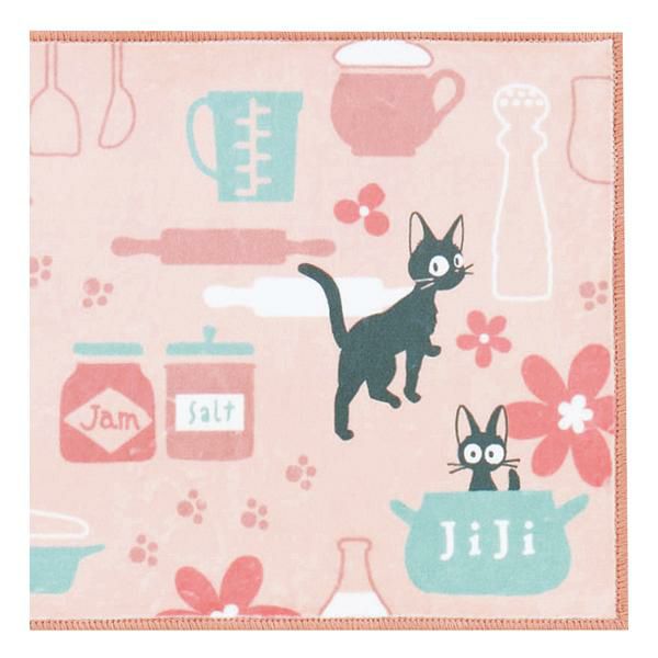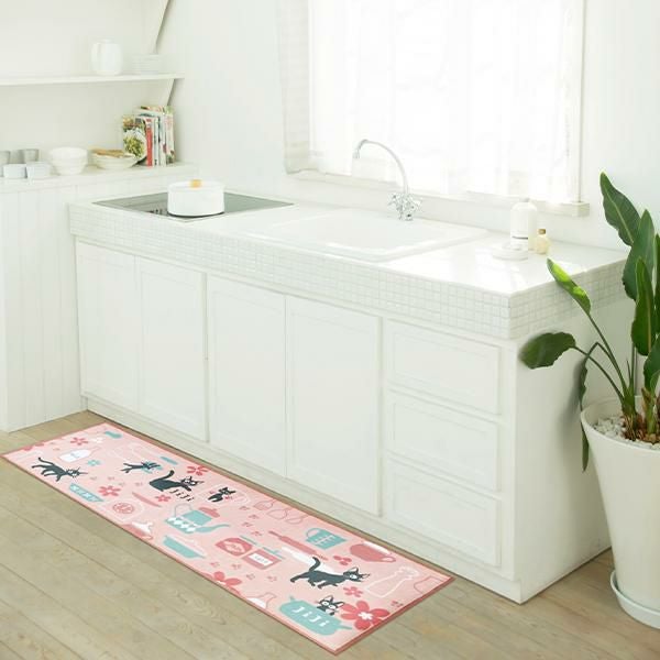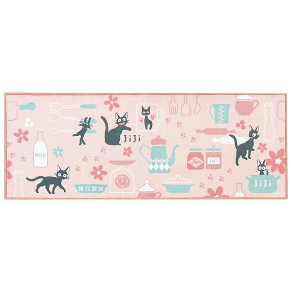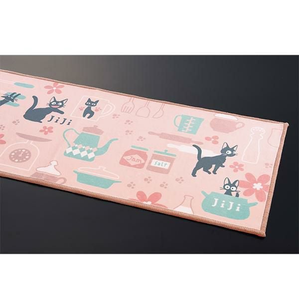 シルキーなポリエステル生地を使用した、滑らかな手触りと色使いが優しい印象のロングマット。ジジがお店で気に入ったマグカップや、ミルク、パン生地を伸ばすめん棒や足跡など…嬉しい作品モチーフを散りばめました♪