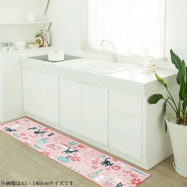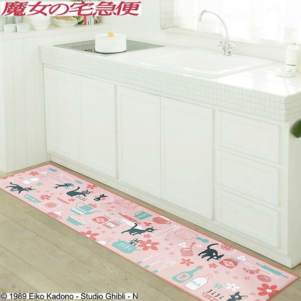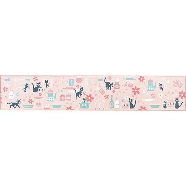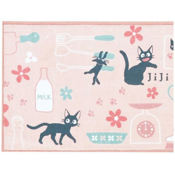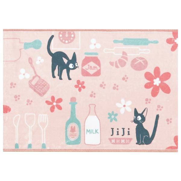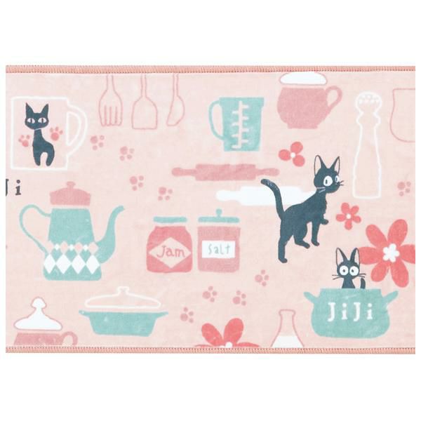シルキーなポリエステル生地を使用した、滑らかな手触りと色使いが優しい印象のロングマット。ジジがお店で気に入ったマグカップや、ミルク、パン生地を伸ばすめん棒や足跡など…嬉しい作品モチーフを散りばめました♪