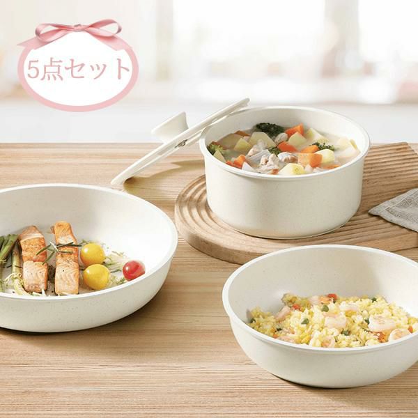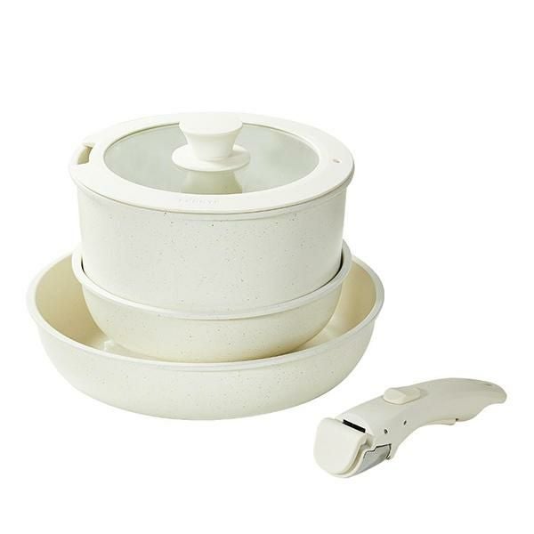 アイボリーでまとめた美しく優しい印象のキッチンツール5点セット。フライパンやポットの取っ手はワンタッチで取り付け可能!取っ手を外せば重ねてコンパクトに収納できます。熱変形に強く丈夫なアルミダイキャスト製で、お手入れしやすい一体成型。軽量仕様と握りやすいハンドルが嬉しい♪IH・ガス火を含むオール熱源対応可能です。