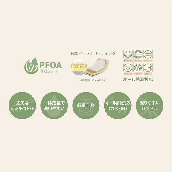 〔フライパン・ポット〕本体/アルミニウム合金、内面/ふっ素樹脂塗膜加工、外面/焼付け塗装、底部/ステンレス鋼(SUS430)