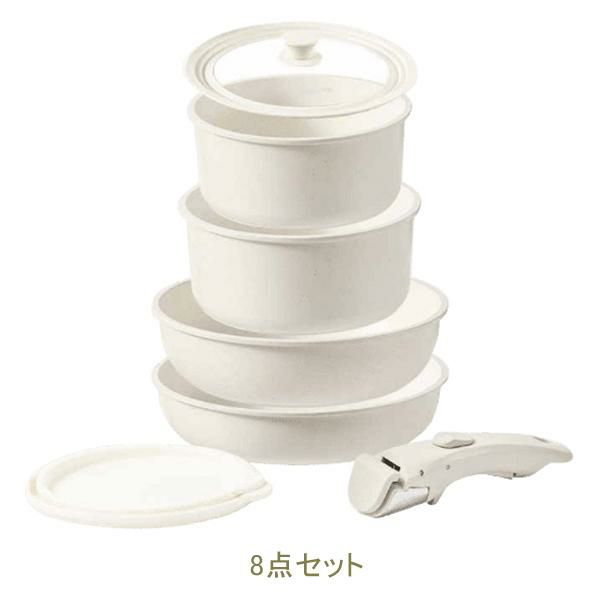 アイボリーでまとめた美しく優しい印象のキッチンツール8点セット。フライパンやポットの取っ手はワンタッチで取り付け可能!取っ手を外せば重ねてコンパクトに収納できます。熱変形に強く丈夫なアルミダイキャスト製で、お手入れしやすい一体成型。軽量仕様と握りやすいハンドルが嬉しい♪IH・ガス火を含むオール熱源対応可能です。