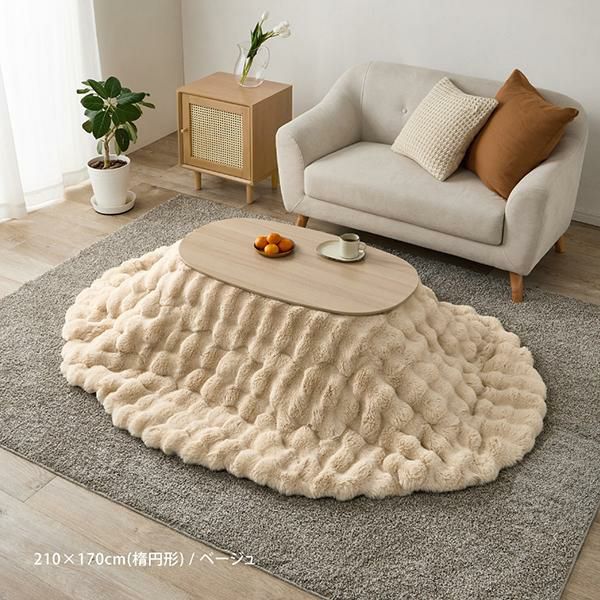 ふわふわとやさしく包み込むような、とろけるような滑らかさに、ぽこぽこした見た目も可愛いオシャレなこたつ布団。ふんわり贅沢なラビットファー調はうさぎの毛並みを表現した、きめ細やかでうっとりするような滑らかな肌触りが特徴です。約3cmの長毛パイルは空気を多く含み、温かさを保ちます。中綿もたっぷりと詰め込んでいるのでほどよい厚みで、裏地には柔らかな微起毛生地のフランネルを使用。静電気が気になる冬でも安心の静電気防止加工済みです。また、洗濯機で洗えるから汚れても安心。いつも清潔にお使いいただけます。