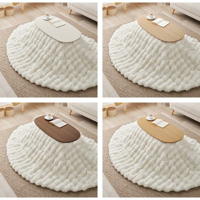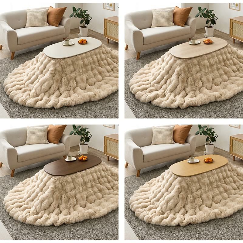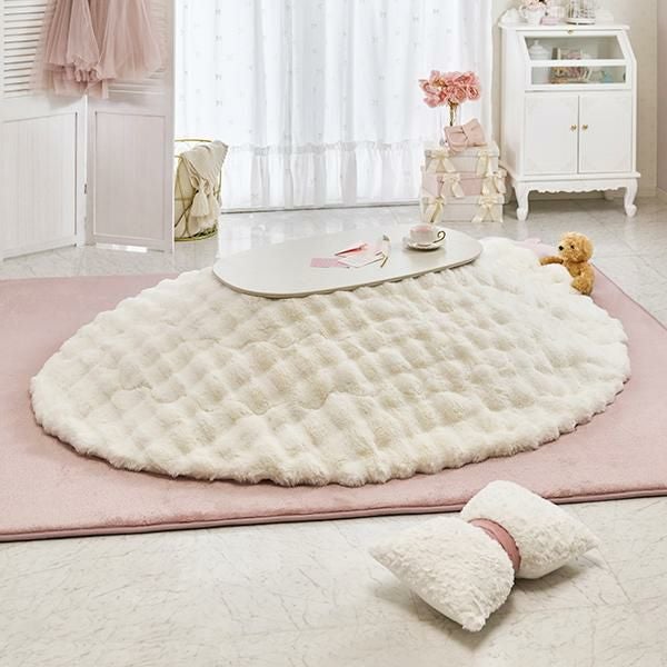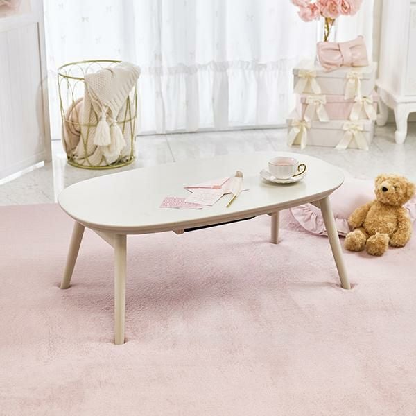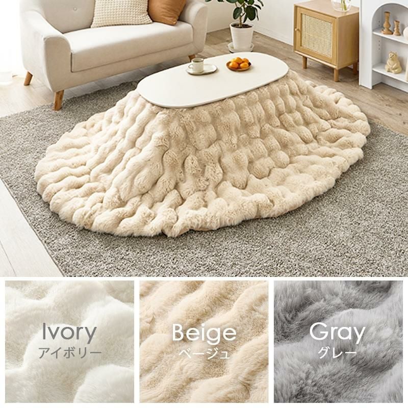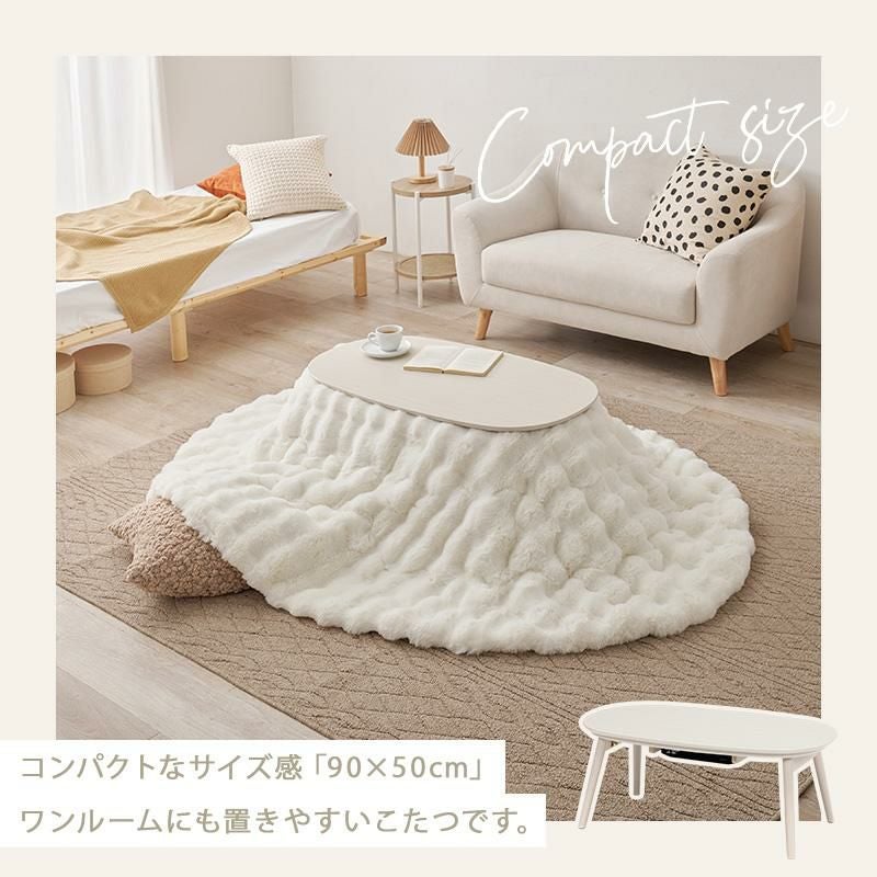 コンパクトな折れ脚こたつテーブルとぽこぽこした生地が特徴的なふわふわの布団をコーディネート。無駄な奥行をカットした折れ脚こたつはコンパクトながら、作業には十分の広さがある天板です。便利な折り畳み式なので使わないときは畳んで収納することもできます。ふわふわのラビットファーのような毛足の長い布団はずっと撫でていたくなるような触り心地です。布団は洗濯機で丸洗いできるので、かわいいだけでなく日々のお手入れも簡単。もちろんテーブのみでオールシーズン使用可能です♪
