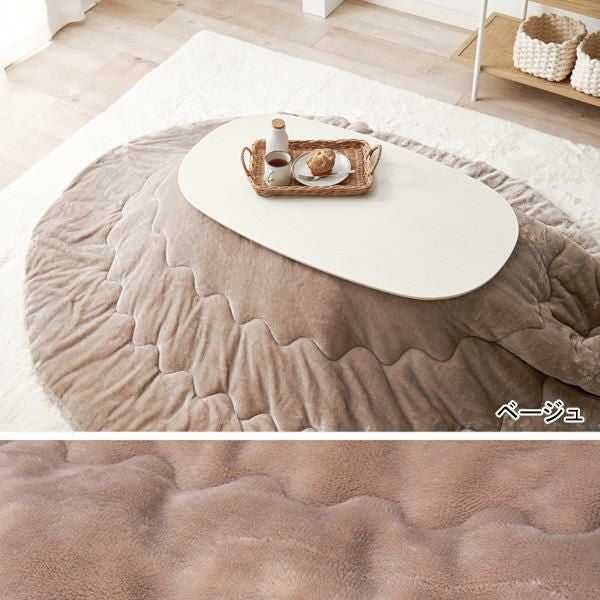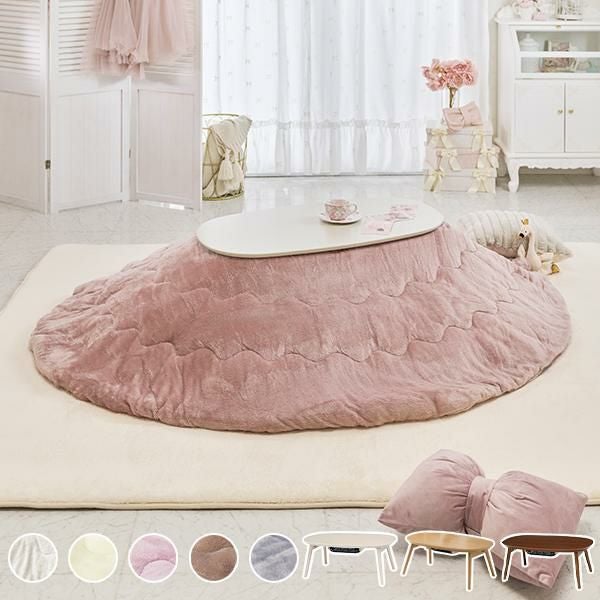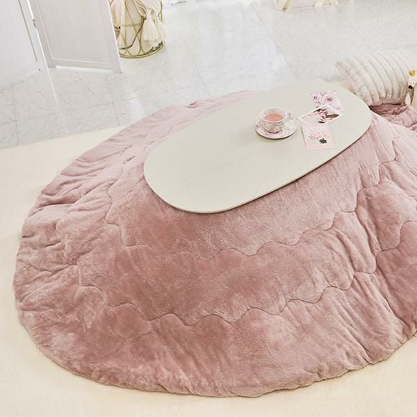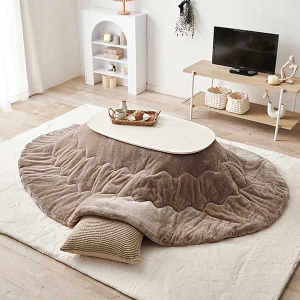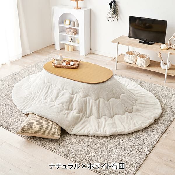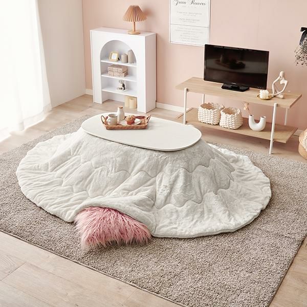 コンパクトな折れ脚こたつテーブルとふわふわのコタツ布団でやさしい印象に。無駄な奥行をカットした折れ脚こたつはコンパクトながら、作業には十分の広さがある天板。便利な折り畳み式なので使わないときは畳んで収納することもできます。こたつ布団はしっとりと柔らかな、ポリエステル100%フランネルを使用。ずっと触れていたくなるような、ふんわりと心地よい肌触りです。布団は洗濯機で丸洗いできるので、かわいいだけでなく日々のお手入れも簡単。もちろんテーブのみでオールシーズン使用可能です♪
