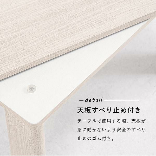 作業には十分の広さがある天板はリバーシブルなので気分に合わせて簡単にイメージチェンジが叶います。便利な折り畳み式で使わないときは畳んで収納可能。こたつ布団はしっとりと柔らかな、ポリエステル100%フランネルを使用。淡く少しくすんだ色味は可愛くなり過ぎず上品な印象で、ずっと触れていたくなるようなふんわりと心地よい肌触りです。布団は洗濯機で丸洗いできるので、かわいいだけでなく日々のお手入れも簡単!もちろんテーブのみでオールシーズン使用可能です♪