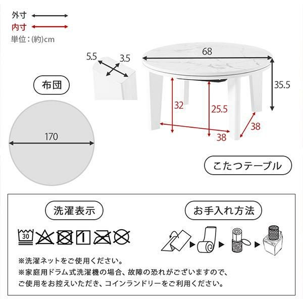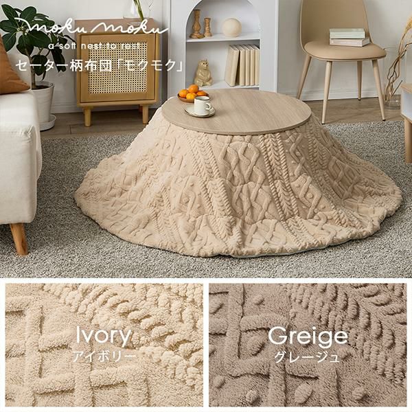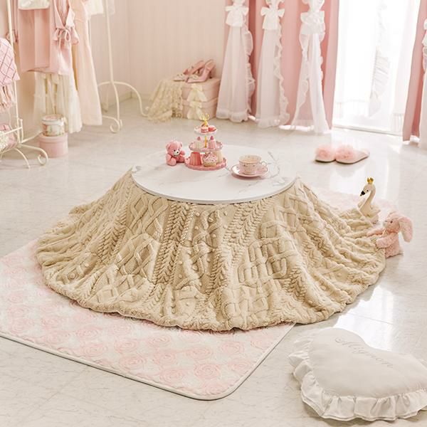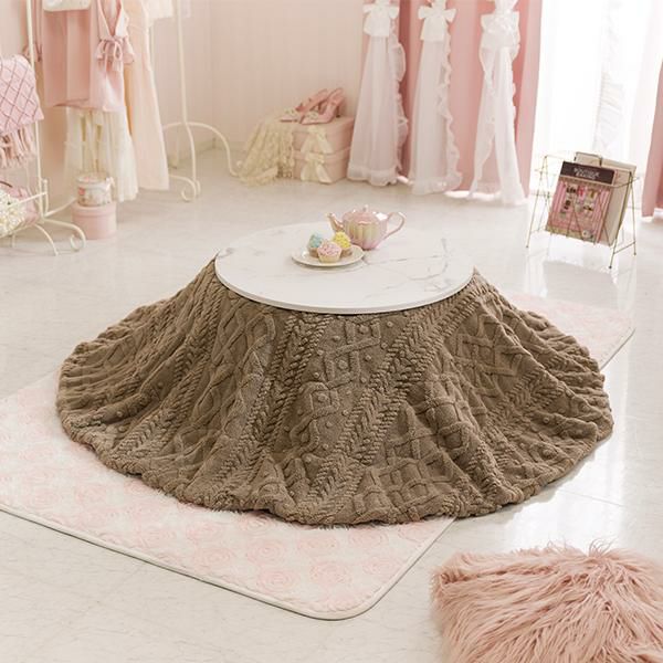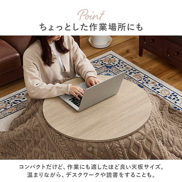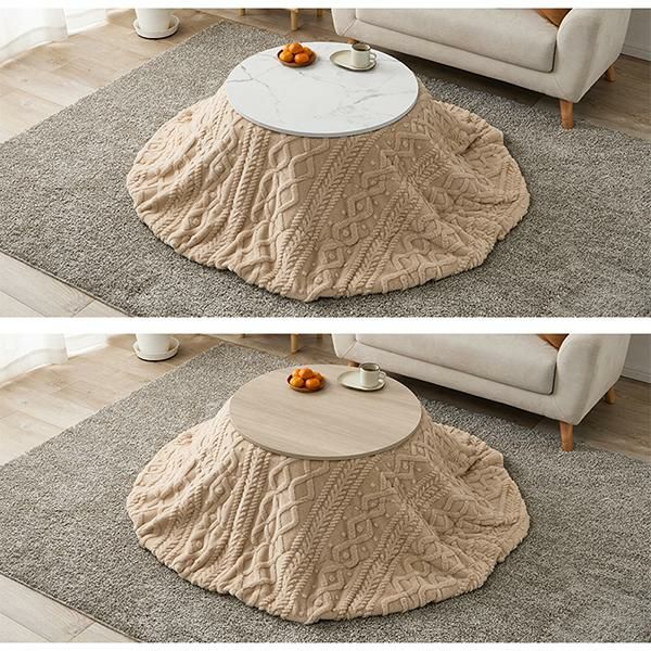 柔らかい印象を与える丸形天板にシュッとした脚で、お部屋に置いてもおしゃれなこたつテーブル。ワンルームにも置きやすい直径68cmはコンパクトながら、作業にも適した程よい天板サイズ。温まりながら、デスクワークや読書ができます。こたつに見えない、シンプルなデザインなので、オールシーズンローテーブルとして使用できます。セットのこたつ布団はケーブルニットの凹凸を再現したジャガード織。ふんわり軽くて暖かい毛足の長いボア生地が撫でていたくなる触り心地。洗濯機で洗えるのでお手入れも簡単です♪