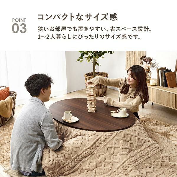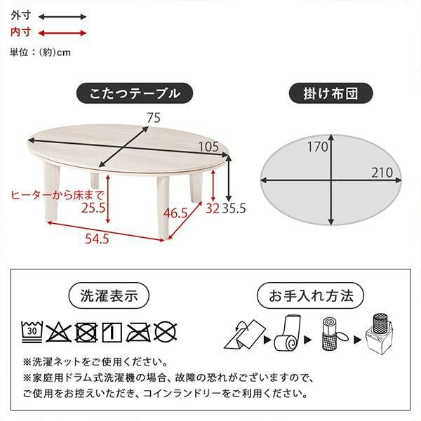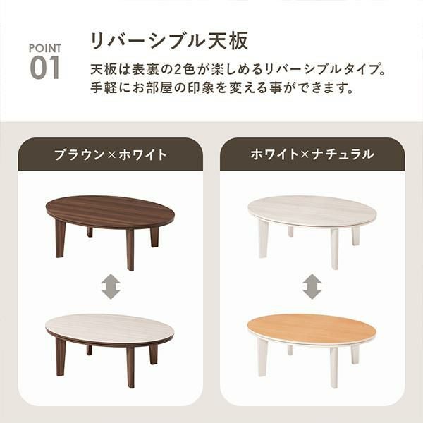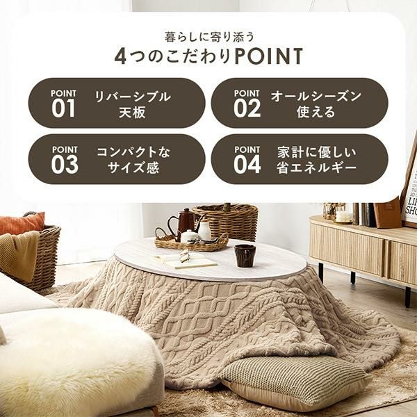 天板がリバーシブルでオールシーズン活躍するカジュアルコタツ。温かみのある木目調で、簡単にお部屋の印象を変えることができます。シンプルなデザインなので、冬はこたつとして、夏はローテーブルとして年中お使いいただけます。コンパクトなお部屋にも置きやすい省スペースの楕円形で、1~2人使いにぴったりのサイズ感。コンパクトながら作業にも適した程よい天板サイズなので、温まりながら、デスクワークや読書ができます。セットのこたつ布団はケーブルニットの凹凸を再現したジャガード織。ふんわり軽くて暖かい毛足の長いボア生地が撫でていたくなる触り心地。洗濯機で洗えるのでお手入れも簡単です♪