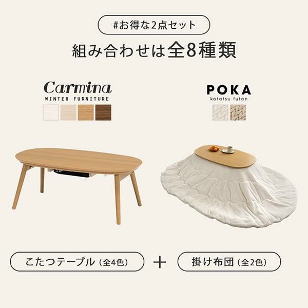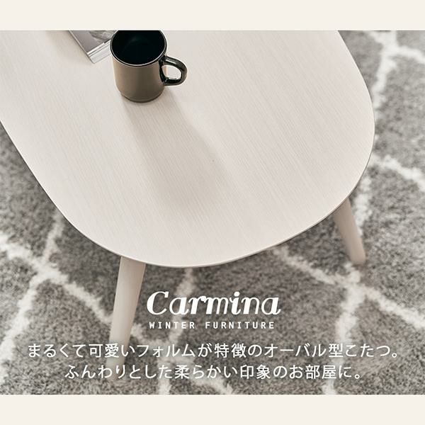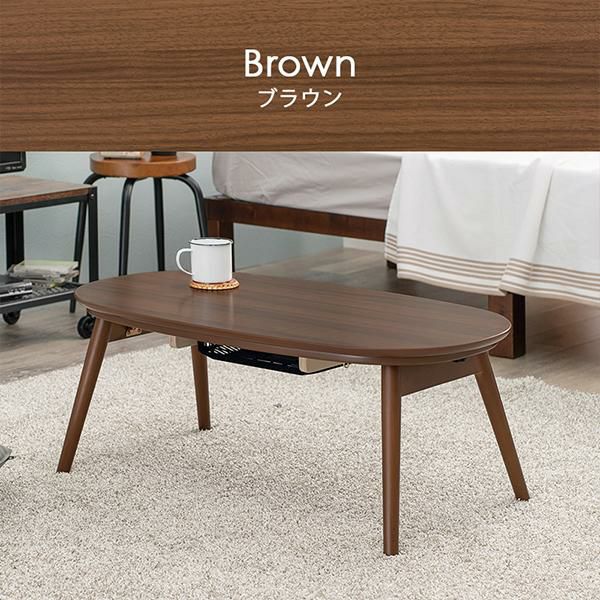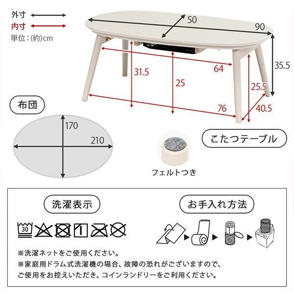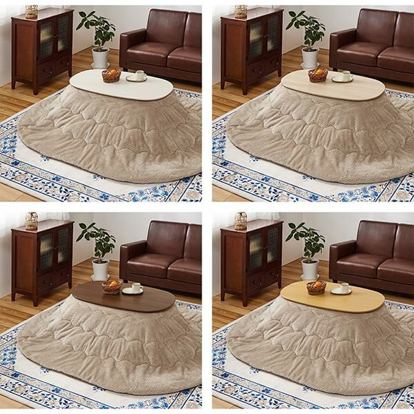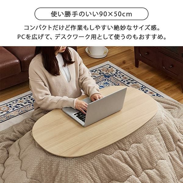まるくて可愛いフォルムが特徴のオーバル型のこたつで、ふんわりとした柔らかい印象のお部屋に。ワンルームにも置きやすいコンパクトなサイズ感で脚を折りたためば、厚みわずか10cmほどになるので、オフシーズンなど使わないときは収納しておくこともできます。コンパクトだけど作業もしやすい絶妙なサイズ感です。セットのこたつ布団は編み込んだような立体感が上品でかわいいニット柄。とろけるような肌触りが魅力的なフランネル生地です。洗濯機で洗えるのでお手入れも簡単♪