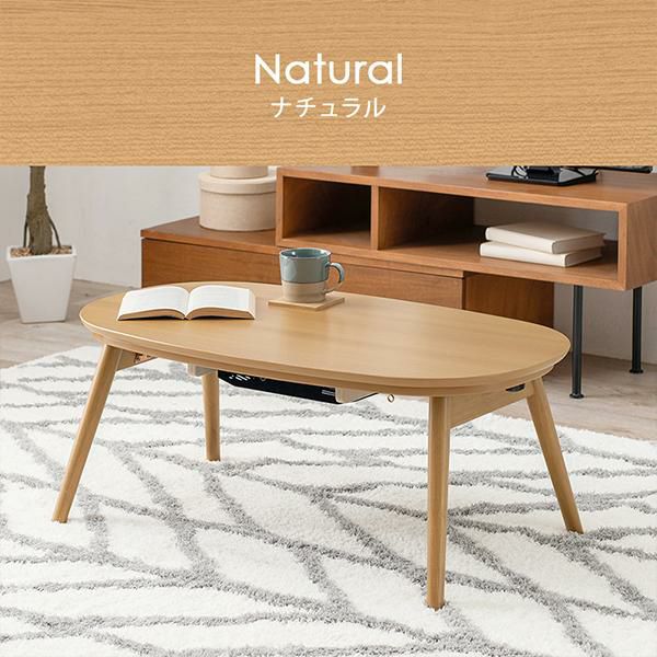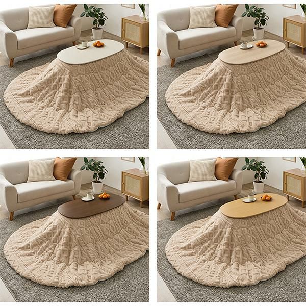 まるくて可愛いフォルムが特徴のオーバル型のこたつで、ふんわりとした柔らかい印象のお部屋に。ワンルームにも置きやすいコンパクトなサイズ感で脚を折りたためば、厚みわずか10cmほどになるので、オフシーズンなど使わないときは収納しておくこともできます。コンパクトだけど作業もしやすい絶妙なサイズ感です。セットのこたつ布団はケーブルニットの凹凸を再現したジャガード織。ふんわり軽くて暖かい毛足の長いボア生地が撫でていたくなる触り心地。洗濯機で洗えるのでお手入れも簡単です♪