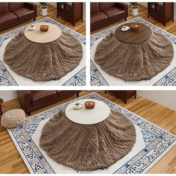 脚を折りたためば、厚みわずか11.5cmほどになるので、オフシーズンなど使わないときは収納しておくこともできます。セットのこたつ布団はケーブルニットの凹凸を再現したジャガード織。ふんわり軽くて暖かい毛足の長いボア生地が撫でていたくなる触り心地。洗濯機で洗えるのでお手入れも簡単です♪